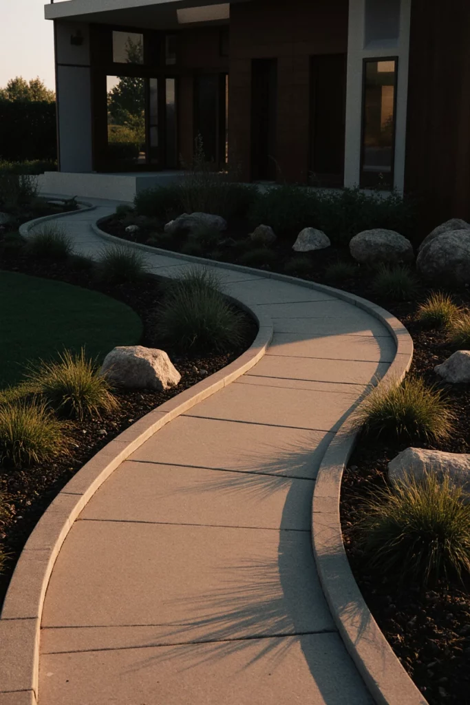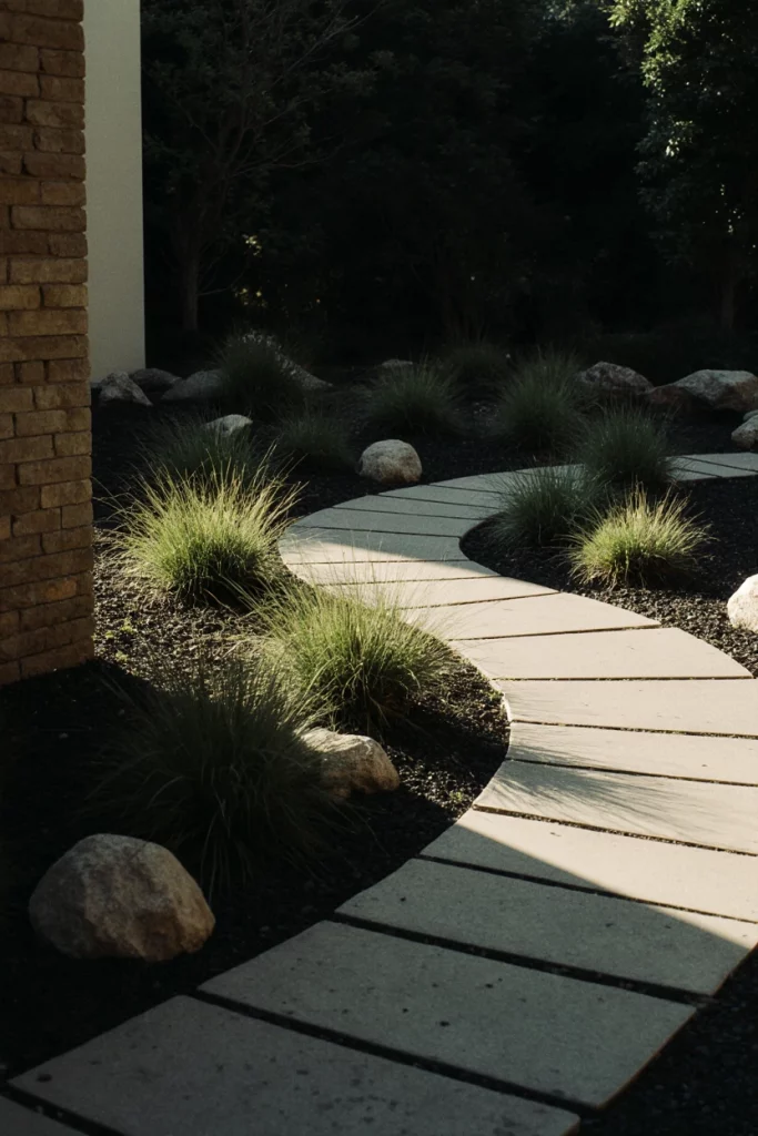 A sculpted walkway brings a welcoming rhythm to your entry, pairing curved lines with natural plants to boost curb appeal without overwhelming the space. Mixing gravel textures, layered shrubs, and a clean layout house entrance keeps the design modern yet approachable. Native plants subtly soften each turn, making the arrival feel intentional and warm.