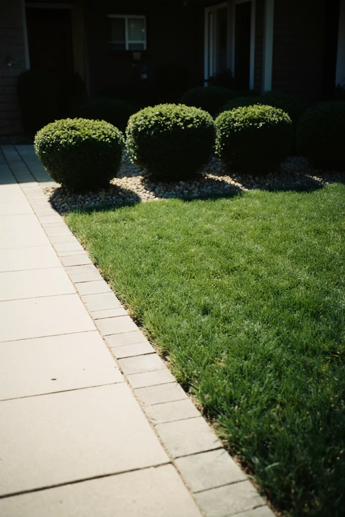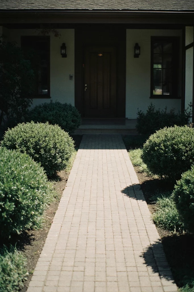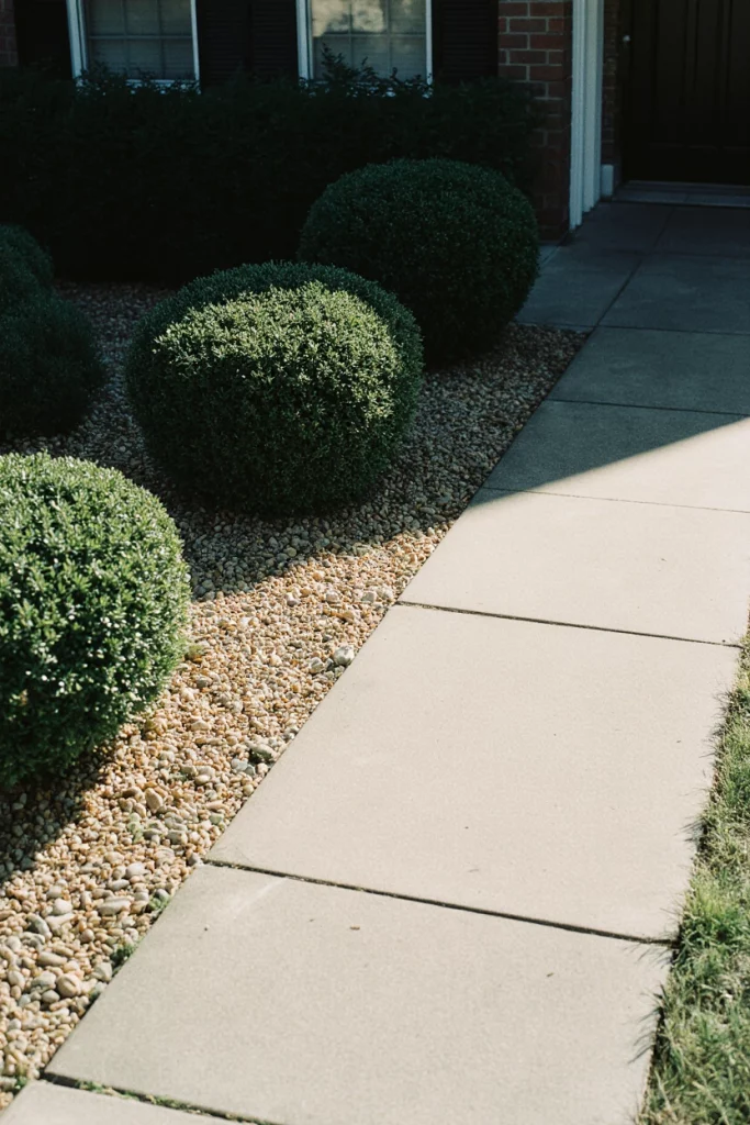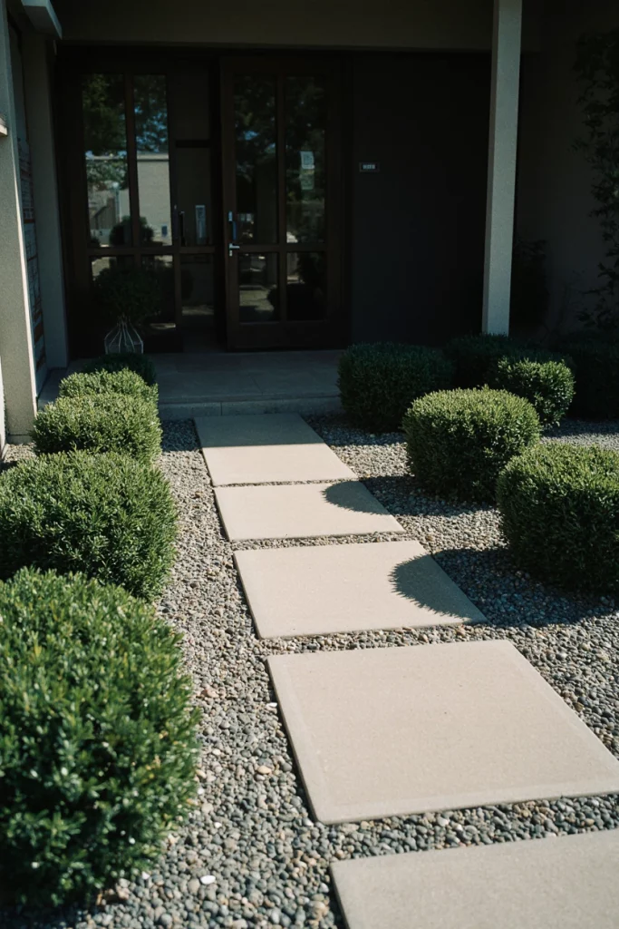 A refined walkway lined with compact shrubs gives a polished look while complementing a tidy layout curb appeal approach. The structural greenery frames the path and pairs beautifully with low-profile stones or gravel. This works especially well with simple front yard styles that embrace symmetry.