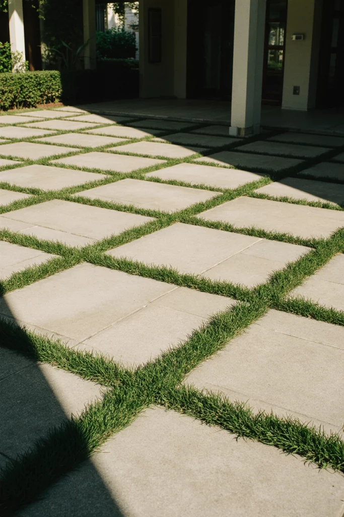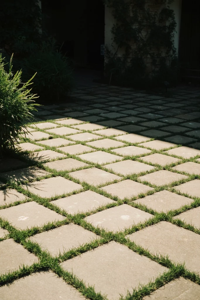 A checkerboard pattern blends turf with stone slabs, giving a modern twist to traditional walkways. The mix of grass and cool stone adds energy and dynamism without overwhelming a small layout. The geometric rhythm feels clean and fresh, especially in contemporary homes.