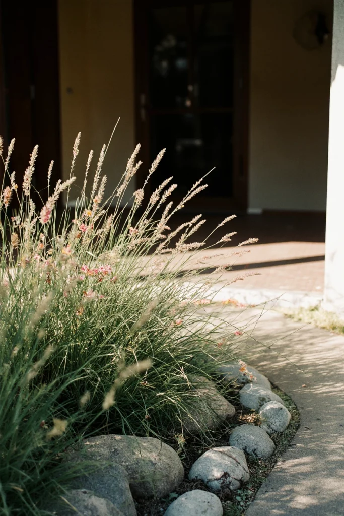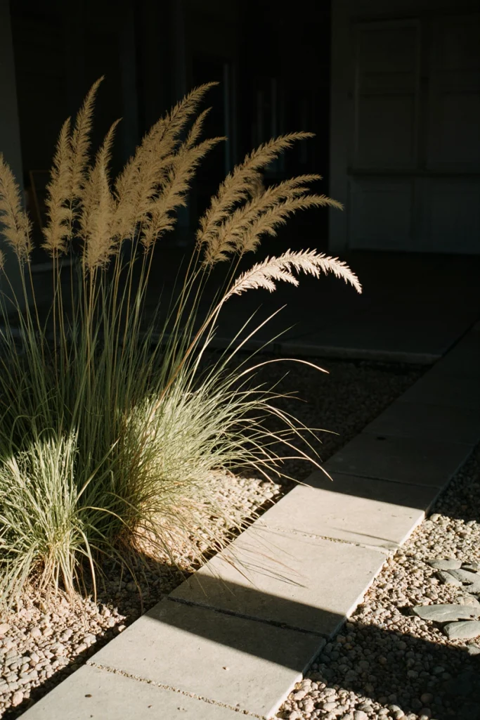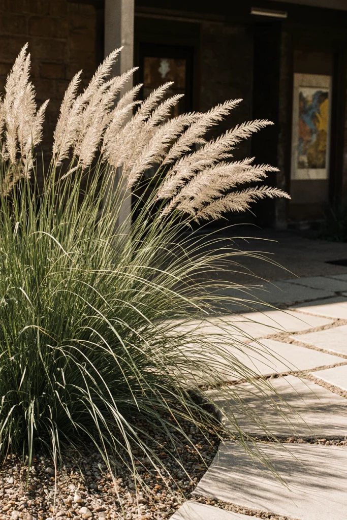 Tall ornamental grasses bring softness and movement, framing a clean layout house entrance with vertical rhythm. Their feathery plumes contrast beautifully with hardscape elements and work well with ideas for low-maintenance designs due to their resilience and durability.