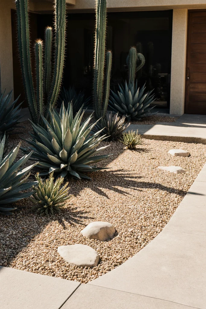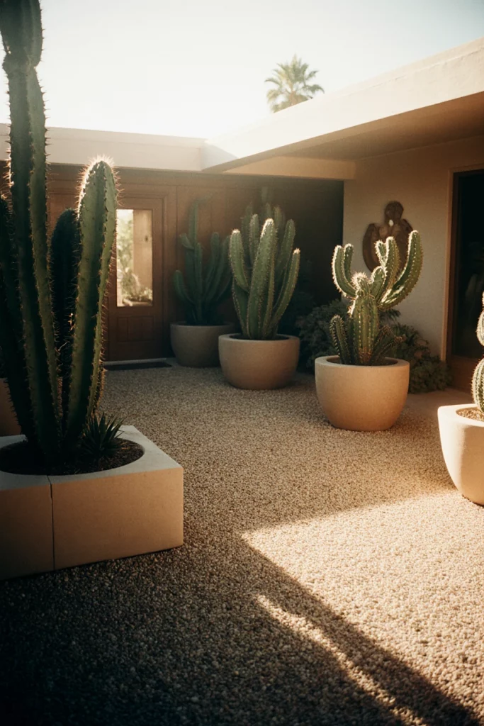 A Palm Springs–inspired entry pairs bold geometry with warm desert tones. Think sculptural cacti, cinematic stone lines, and a streamlined path that enhances Palm Springs sensibilities. Mixing sandy textures with mid-century accents gives any layout a breezy, modern glow.