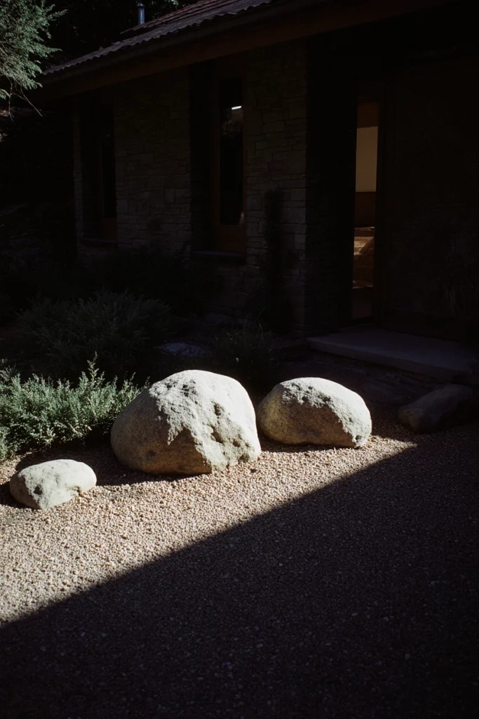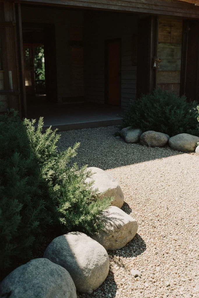 Large boulders give the yard structure and an earthy presence, framing pathways or plant beds elegantly. Using large stones contrasts beautifully with fine gravel and small shrubs while supporting a simple and polished landscape aesthetic. Their grounded feel anchors the entire front design.