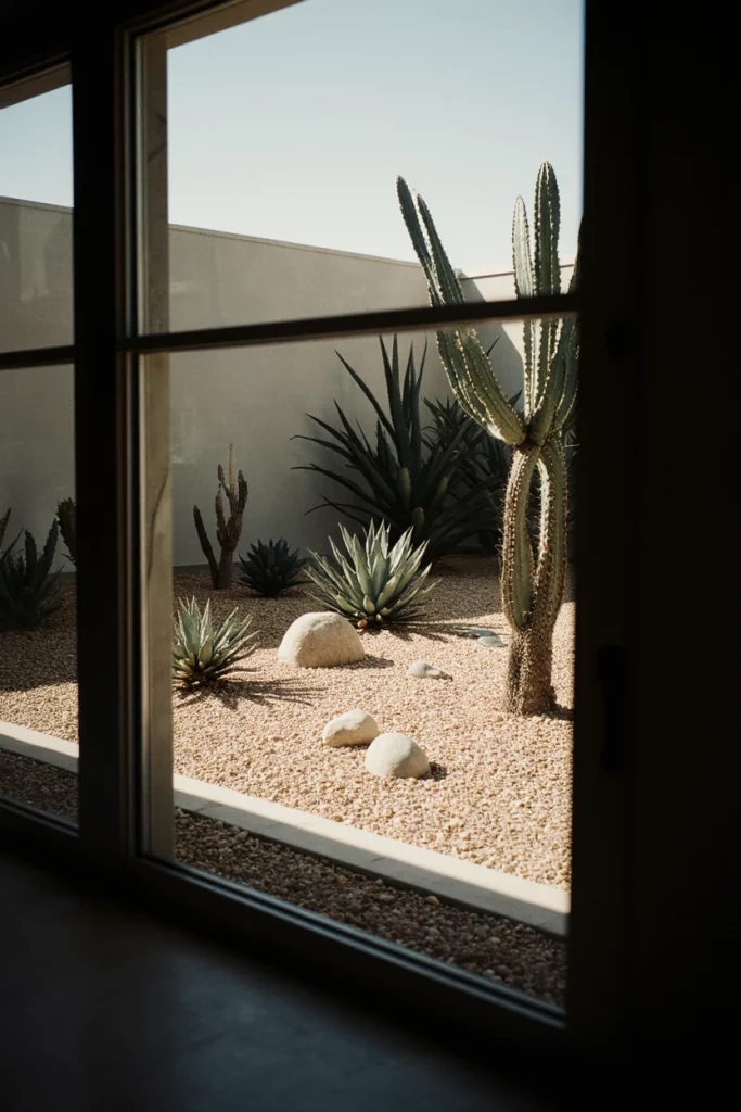A grass-free approach connects beautifully with modern Southwestern vibes, especially when paired with sculptural succulents and a bold Palm Springs influence. Replacing turf with sand, stone, and structured greenery gives your home a standout look while supporting low-maintenance living. The openness makes even small yards appear expansive.