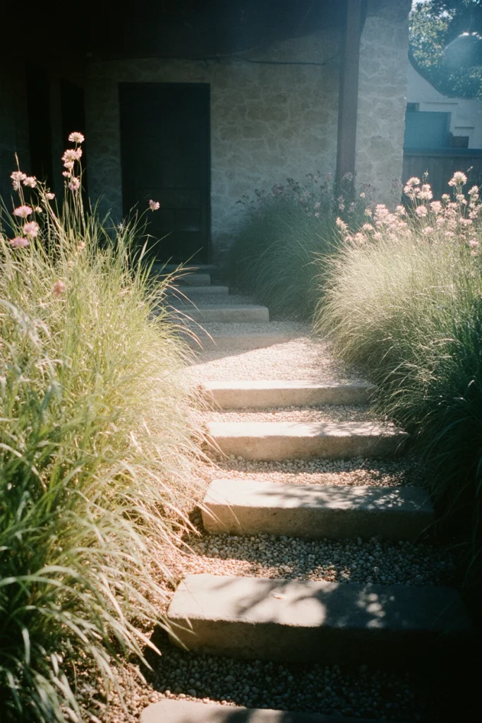 A casual stone path surrounded by meadow grasses creates a breezy, organic feel. Pairing textured stones with billowy plants complements modern naturalism and enhances ideas that favor soft edges. This relaxed look feels grounded and peaceful from the first step to the porch.