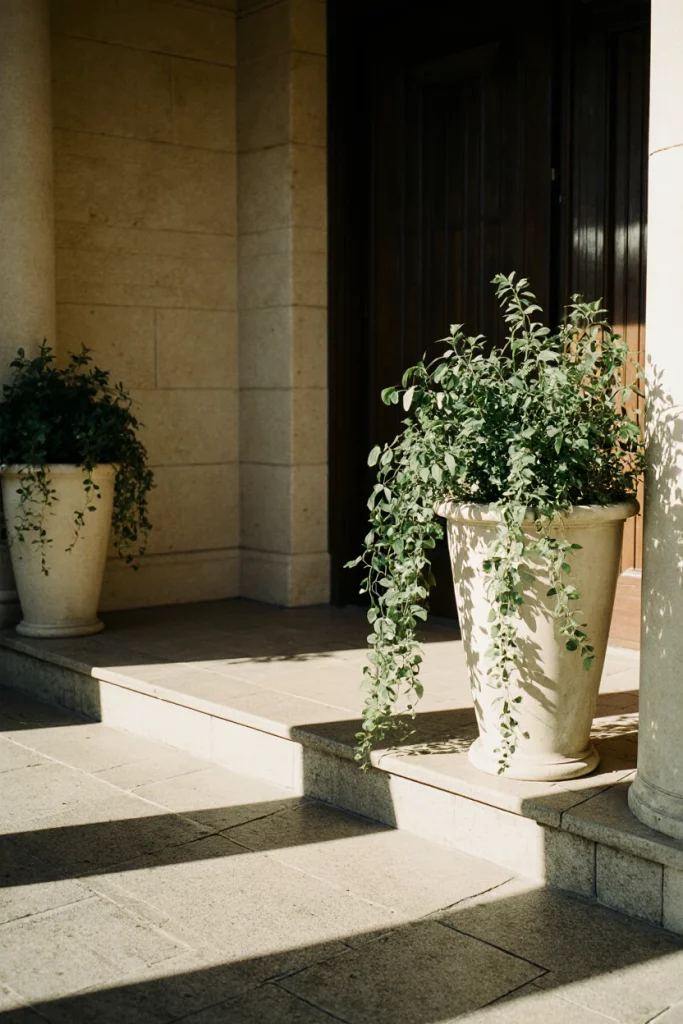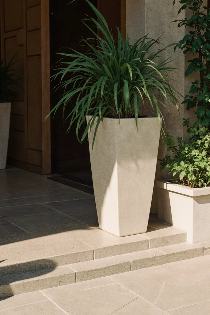 Oversized containers instantly pull attention to the entrance and elevate even a simple layout house. Ceramic, concrete, or matte metal pots filled with layered greenery offer effortless structure, and thoughtfully placed pots and planters can spotlight the door while keeping things neat. Their sculptural quality helps define the walkway with minimal effort.