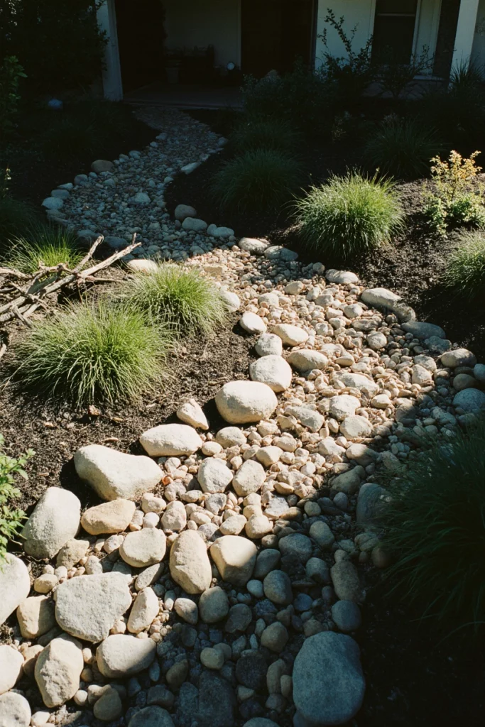 Where it works best: sloped yards or homes in rainy regions where water naturally gathers. A dry creek bed channels excess flow safely while doubling as a decorative focal point that blends beautifully with drought-friendly planting styles.