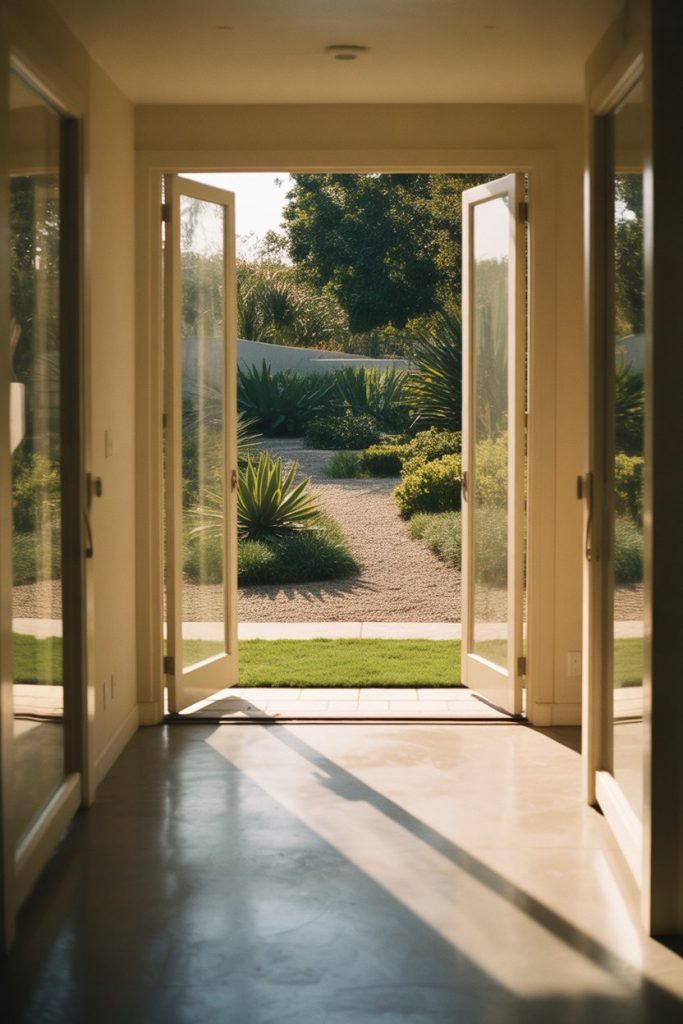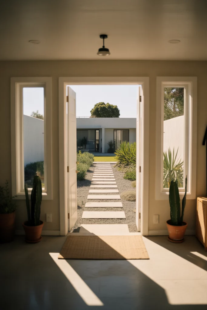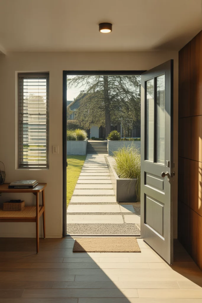 This first idea keeps your entry sleek and calm, perfect if you crave a modern look but want truly low-maintenance care. Think smooth concrete pavers leading to the front door, a narrow band of tidy ornamental grasses, and a crisp line of grass instead of fussy beds. The effect feels airy and current, while still softening the architecture with movement and texture around the walkway.