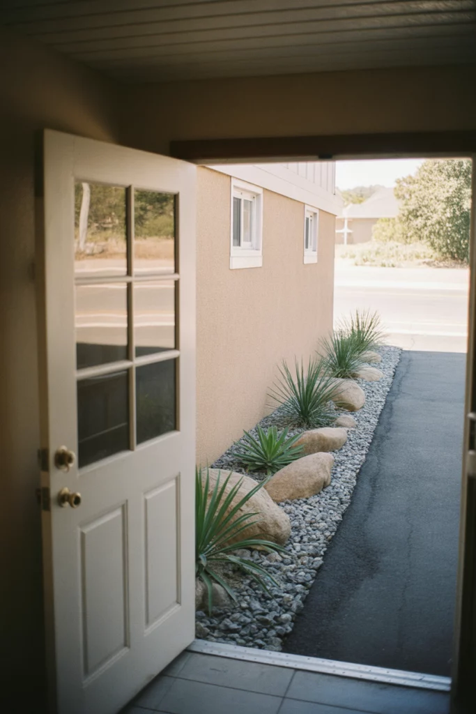 A narrow strip between driveway and walk is the perfect spot for a mini rock garden that reads Low-maintenance but high style. Combine small rocks with drought-tolerant groundcovers and a few sculptural plants. If your home leans farmhouse, choose softer, rounded boulders; for a crisp look, go with angular stones and spiky grasses to echo modern lines.
