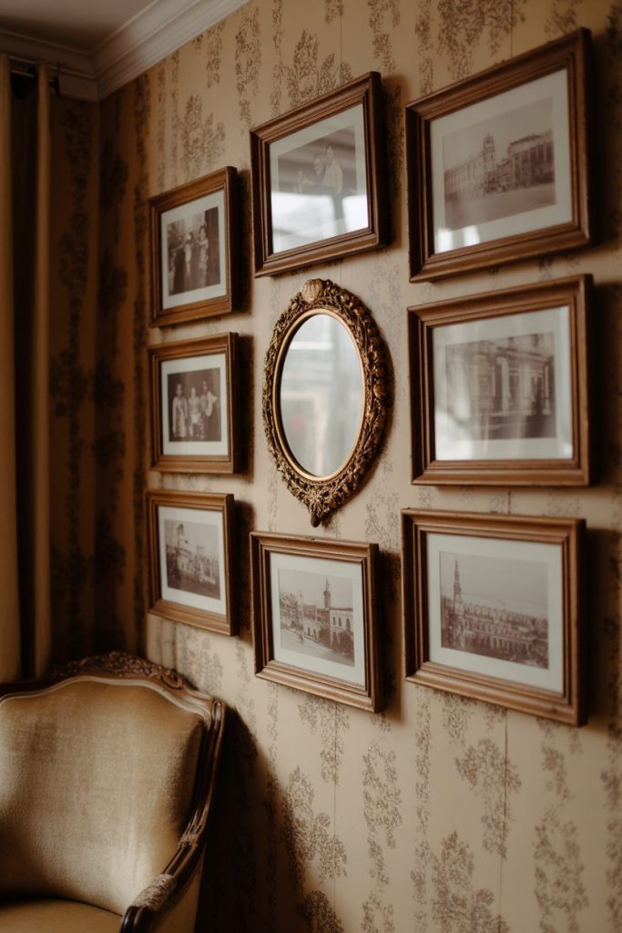 A vintage story wall brings warmth and nostalgia to the living room. Combine old postcards, sepia-toned family photo prints, and vintage-inspired frames with brass or distressed wood. Add a few antique finds like small clocks or ornate mirror accents. This idea works beautifully above a fireplace or sofa, creating a cozy, lived-in feel reminiscent of heritage homes.