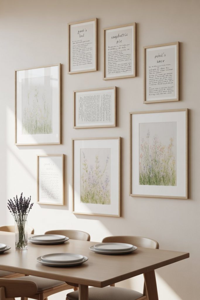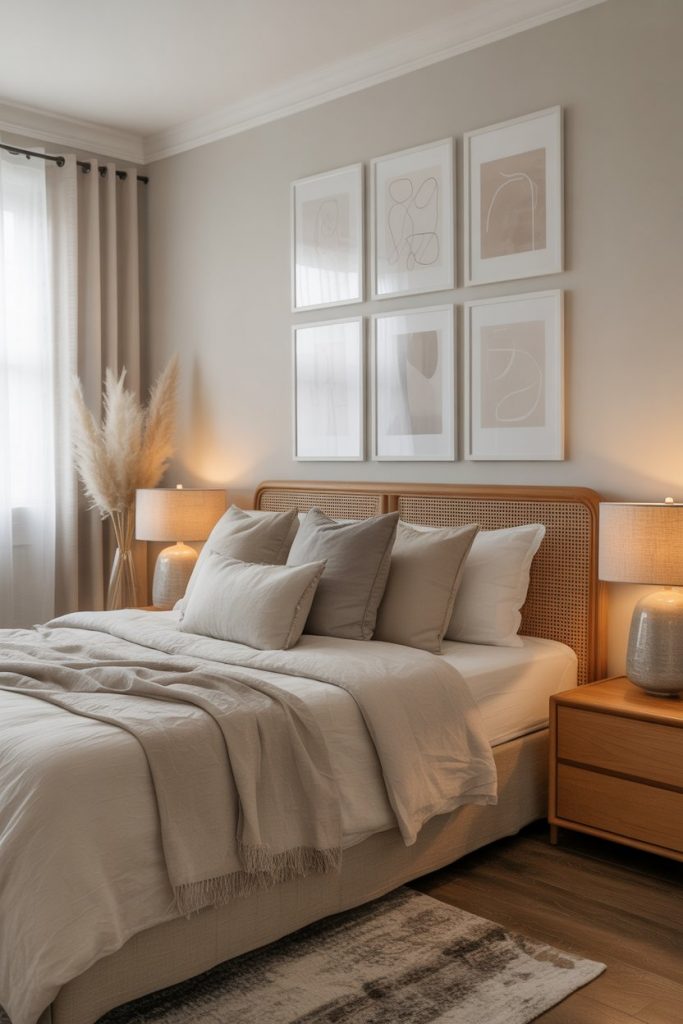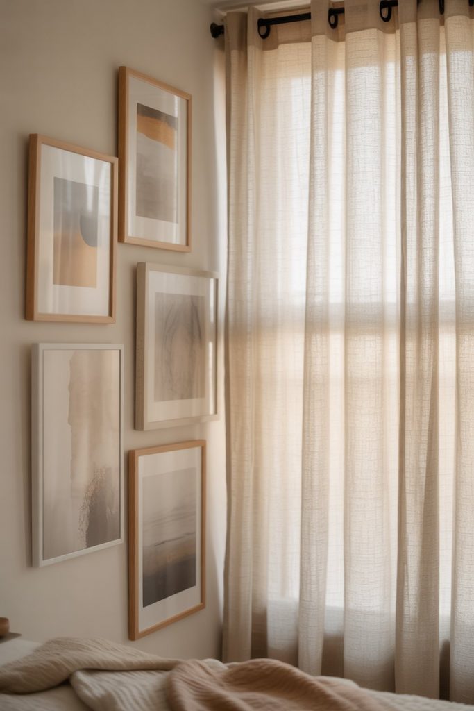 For a calming bedroom, use a palette of beige, ivory, and soft grays. Frame minimalist drawings, abstract line art, and neutral photo prints. The unique charm lies in texture—linen mats, wood grain frames, and subtle lighting. This tranquil setup encourages rest and complements soft boho bedding or natural fabrics.
