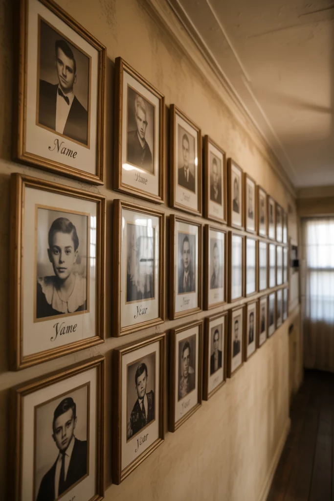 Turn your hallway into a visual timeline of your family’s story. Use black-and-white family photo portraits from multiple generations, framed in consistent colors for unity. Add handwritten names or years beneath each frame for a sentimental touch. This idea celebrates history while keeping design sleek and modern.