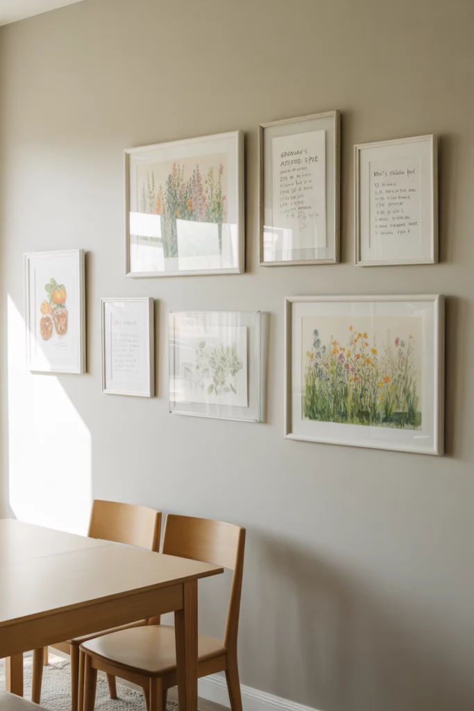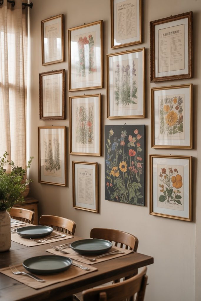 Bring warmth to your kitchen or dining room with a curated collage of vintage-inspired recipe prints, botanical sketches, and black-and-white chef portraits. Incorporate colorful details to add life to functional areas. Place your gallery near open shelving or a coffee nook for a lived-in feel. Designers like Joy Cho champion this playful mix for making cooking spaces more joyful.