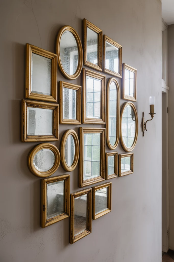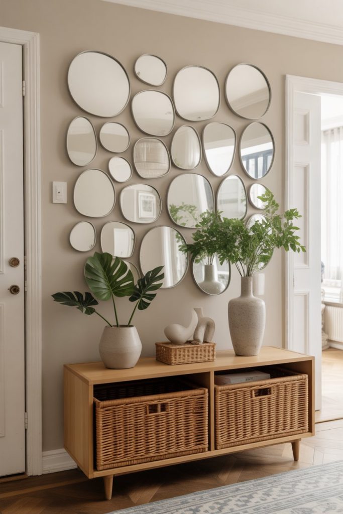 Instead of traditional art, use a collection of small mirror pieces in varied shapes—round, oval, square—to create a reflective mosaic. This works especially well in entryway or hallway spaces, making them appear larger and brighter. For a vintage-inspired twist, mix antique mirrors with new ones for depth and texture.