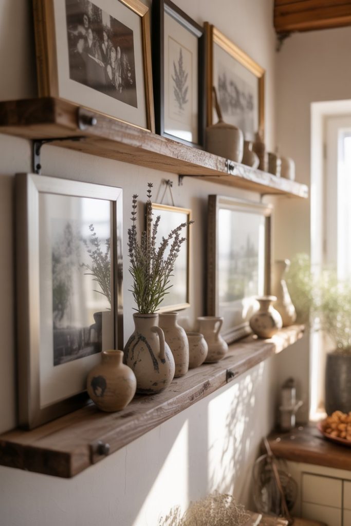 For a farmhouse or vintage aesthetic, build a rustic shelves display combining wooden ledges, framed photos, and pottery. Ideal for the kitchen or living room, this setup adds warmth and texture. Include small potted herbs or recipe cards for personal charm. It feels handmade yet timelessly stylish.