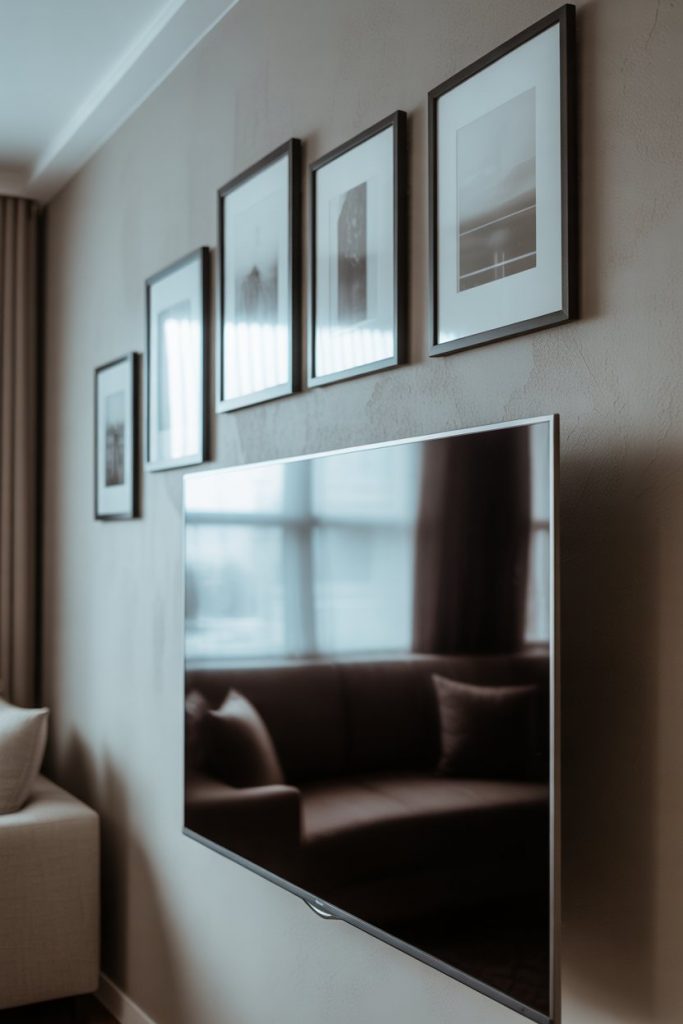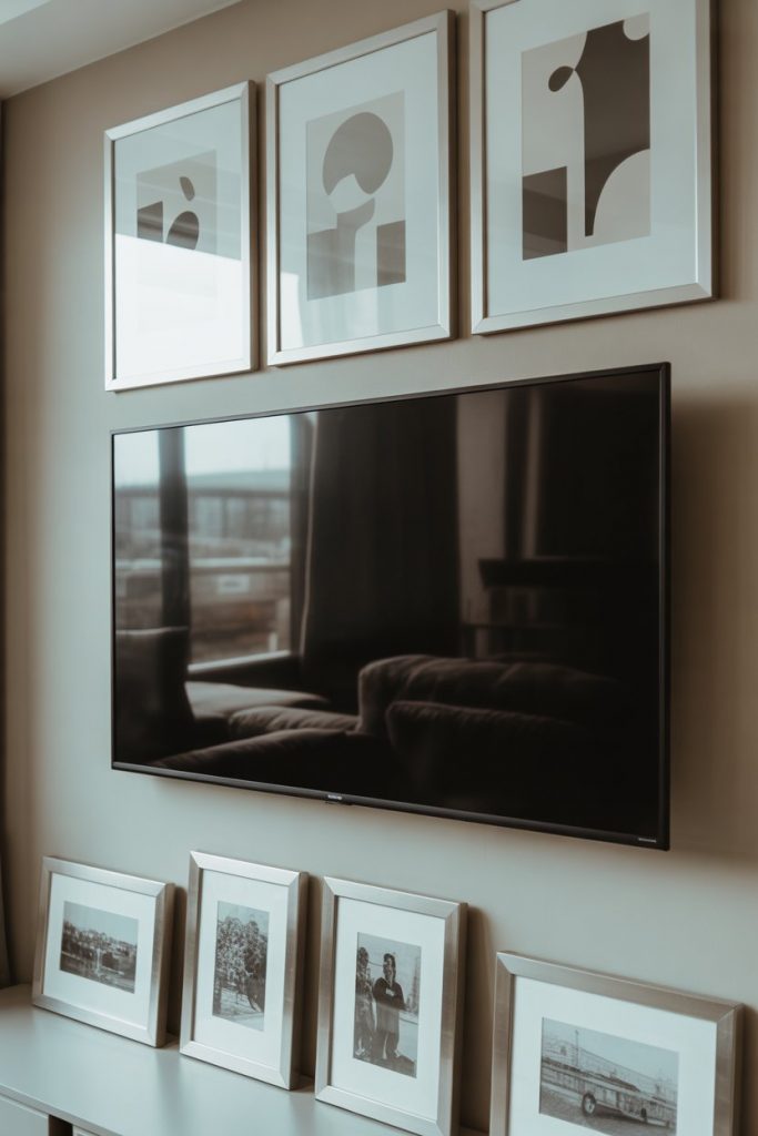 Turn the TV wall into an intentional feature by surrounding it with balanced artwork. Choose simple black frames and neutral photo prints that complement the screen’s shape. This approach integrates technology seamlessly into the décor instead of dominating it. Many designers now treat TVs as part of curated gallery walls.