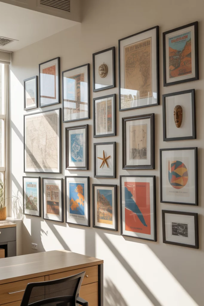For wanderlust lovers, a travel-themed gallery in the office inspires daily motivation. Use retro destination posters, small maps, or colorful prints of landmarks. Add a few DIY travel souvenirs like pressed boarding passes or ticket stubs in shadow boxes. It’s a perfect way to dream between work tasks.
