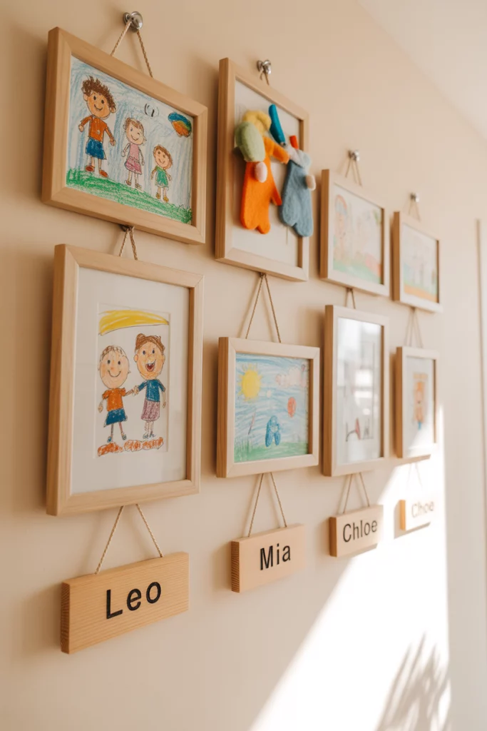Celebrate creativity by turning your child’s artwork into a curated gallery wall. Perfect for a living room corner, hallway, or playroom, frame colorful drawings or DIY crafts in matching frames. Add labels with names and dates to honor their efforts. It’s a joyful, family photo alternative that evolves over time.