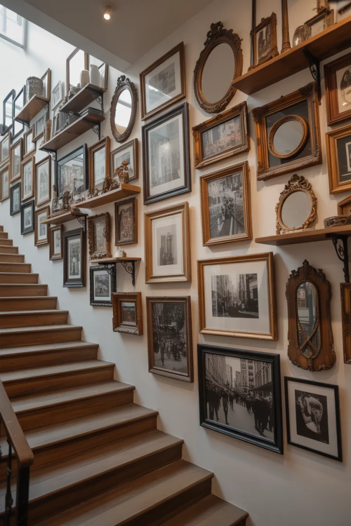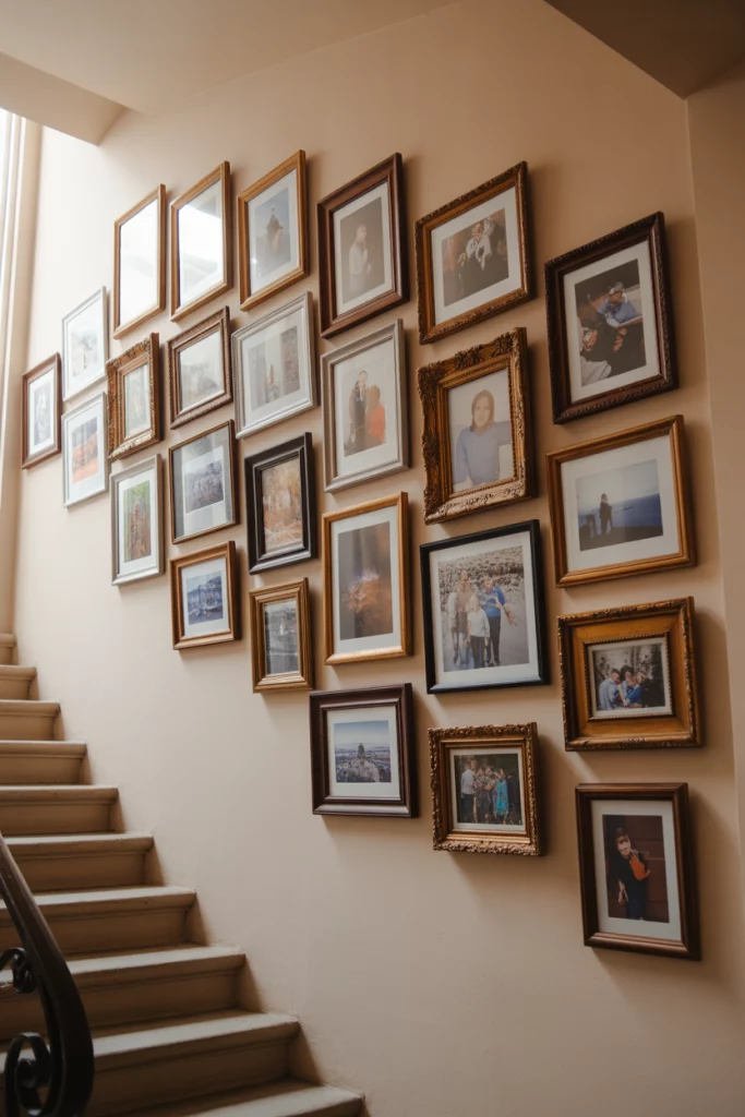 Use your stairs wall as a life timeline. Start from childhood art and move upward through family photo albums, travel shots, and wedding portraits. The ascending visual story symbolizes growth and connection. Keep spacing even and align frames with the stair angle for cohesion. This emotional, museum-like approach turns transitions into memories.