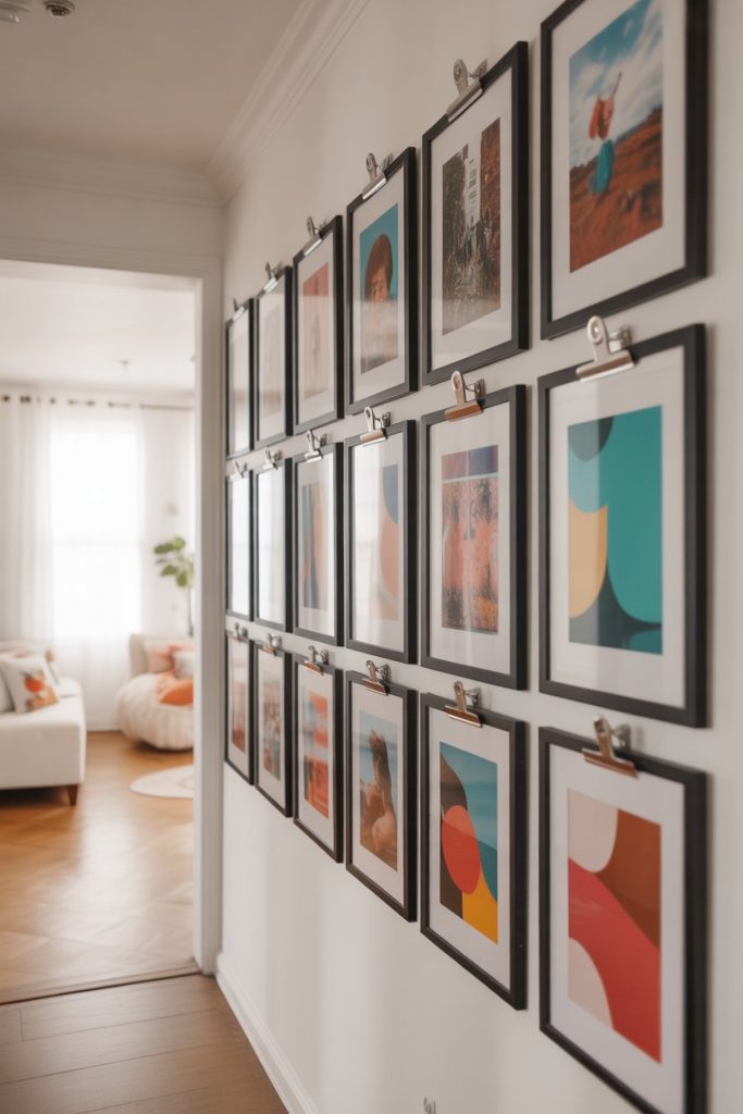 This creative idea features easily interchangeable artwork—perfect for those who love change. Use clip frames or pegboards to display photo prints or posters that you rotate seasonally. In fall, swap in earthy tones; in summer, add colorful beach scenes. Works well in entryway or office spaces for constant renewal.