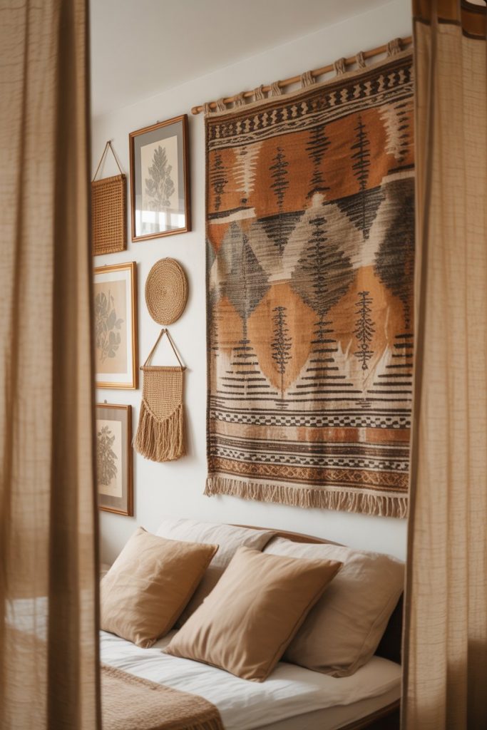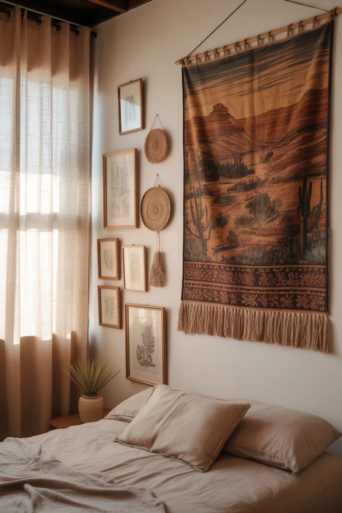 Blend wall hangings with framed art for a rich bohemian vibe. Combine woven tapestries, macramé, photo prints, and vintage art for layered texture. Ideal for a bedroom or creative living room, it channels freedom and artistry. Use warm lighting and natural materials for depth.
