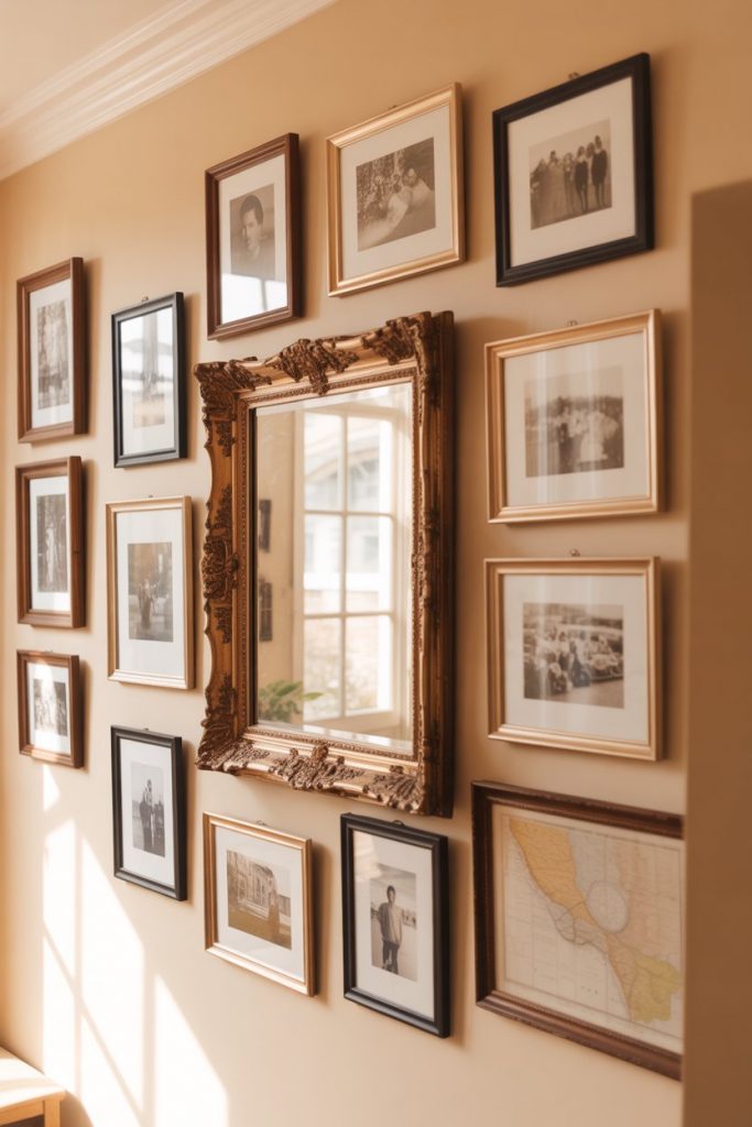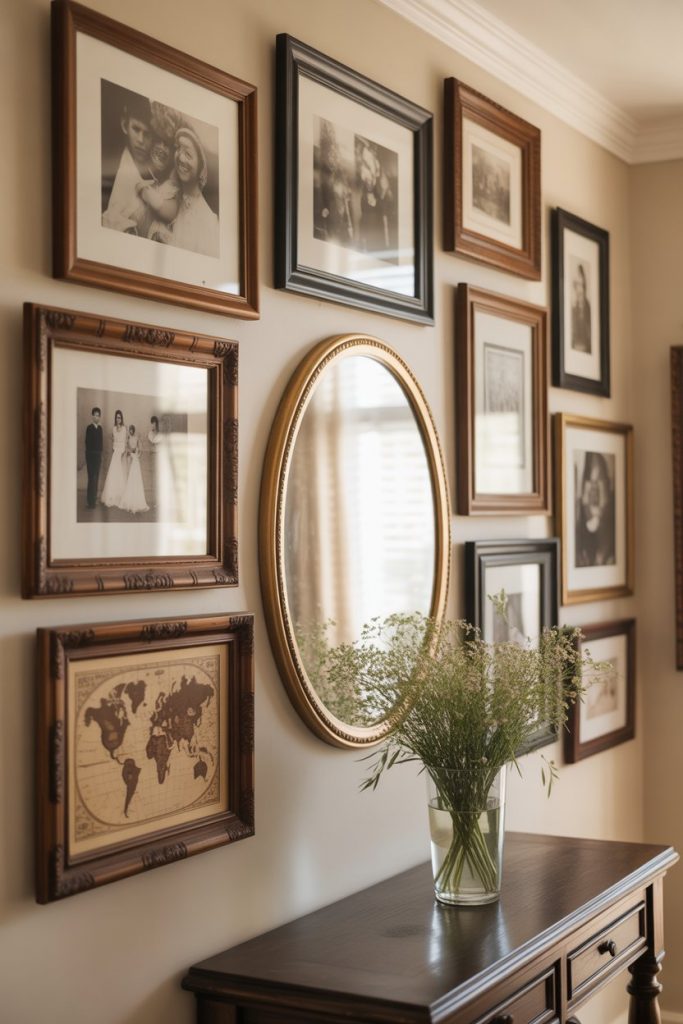 Transform your entryway into a snapshot of your life journey. Combine travel photos, family photo portraits, vintage maps, and wedding pictures. A small mirror can open up the space and add reflection. This gallery wall greets guests with warmth and curiosity, setting the tone for your home. Designers like Kate Riley often note that this personal approach immediately feels inviting and authentic.