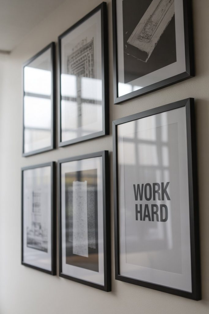 A black-and-white gallery wall in the office is timeless and focus-friendly. Frame line drawings, monochrome photography, and minimalist DIY art. The result is unique, clean, and creative—a perfect backdrop for productivity. Influencers featured in Elle Décor praise this scheme for balancing calmness with inspiration.