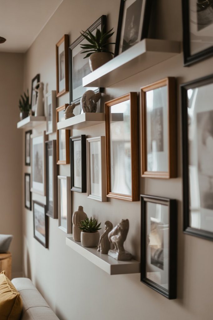 Combine floating shelves with framed pictures for a dynamic display in the living room. This hybrid design allows for layering artwork, sculptures, books, or even plants. It’s ideal for those who enjoy rotating décor seasonally or showing off collected treasures. Design studios like Studio McGee recommend this method for its balance of function and charm.