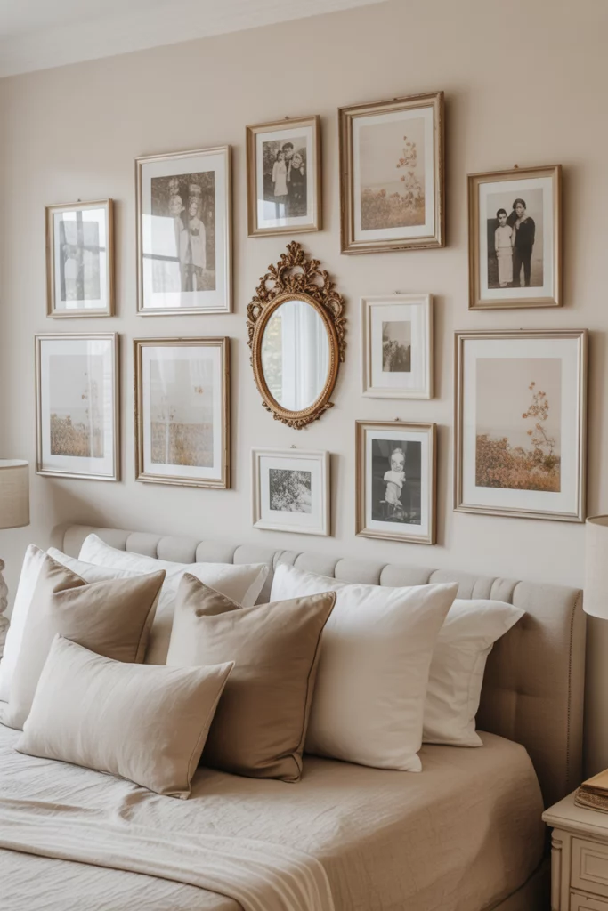 A gallery wall above the headboard instantly adds intimacy to a bedroom. Mix family photo prints, floral art, abstract paintings, and one accent mirror. Keep a consistent frame tone to create cohesion—think soft wood or white. This approach makes your resting space both vintage in sentiment and modern in design. It’s a favorite trick among lifestyle bloggers for cozy personalization.