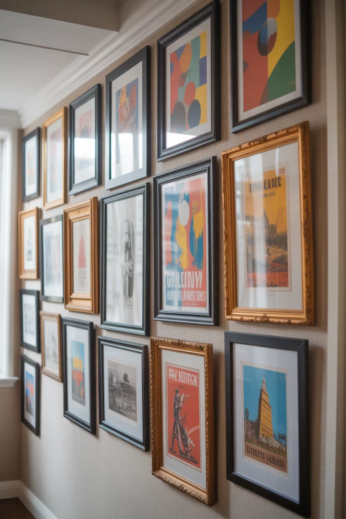 The eclectic salon-style arrangement is perfect for those who crave personality and movement. Mix frame sizes, textures, and finishes from floor to ceiling, creating that Parisian art-house energy. Add mirror accents, photo prints, and even floating shelves for dimension. This layered look thrives in a hallway, stairs, or dining room, turning every glance into an adventure.
