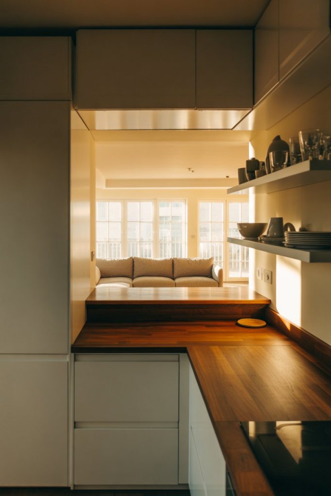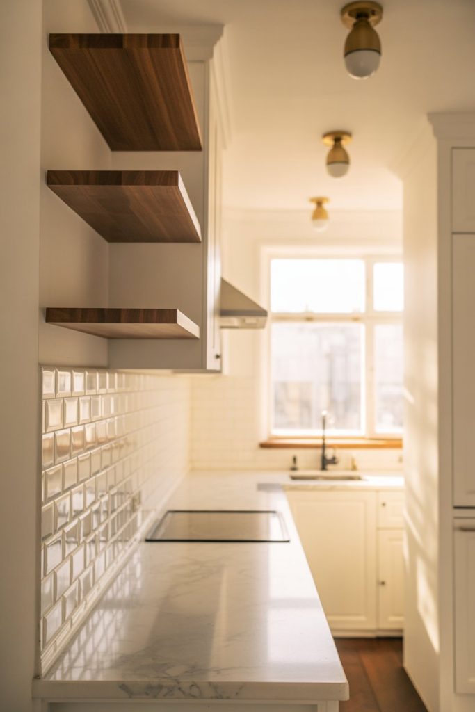 A white galley kitchen with open shelving is a timeless choice that maximizes light and visual space. This design works especially well in narrow spaces where upper cabinets can make walls feel heavy. Floating shelves in light wood or metal brackets keep the look airy while offering accessible storage for everyday dishes and glassware. Pair this approach with a simple subway tile backsplash and matte white countertops for a clean, Scandinavian-inspired aesthetic.
