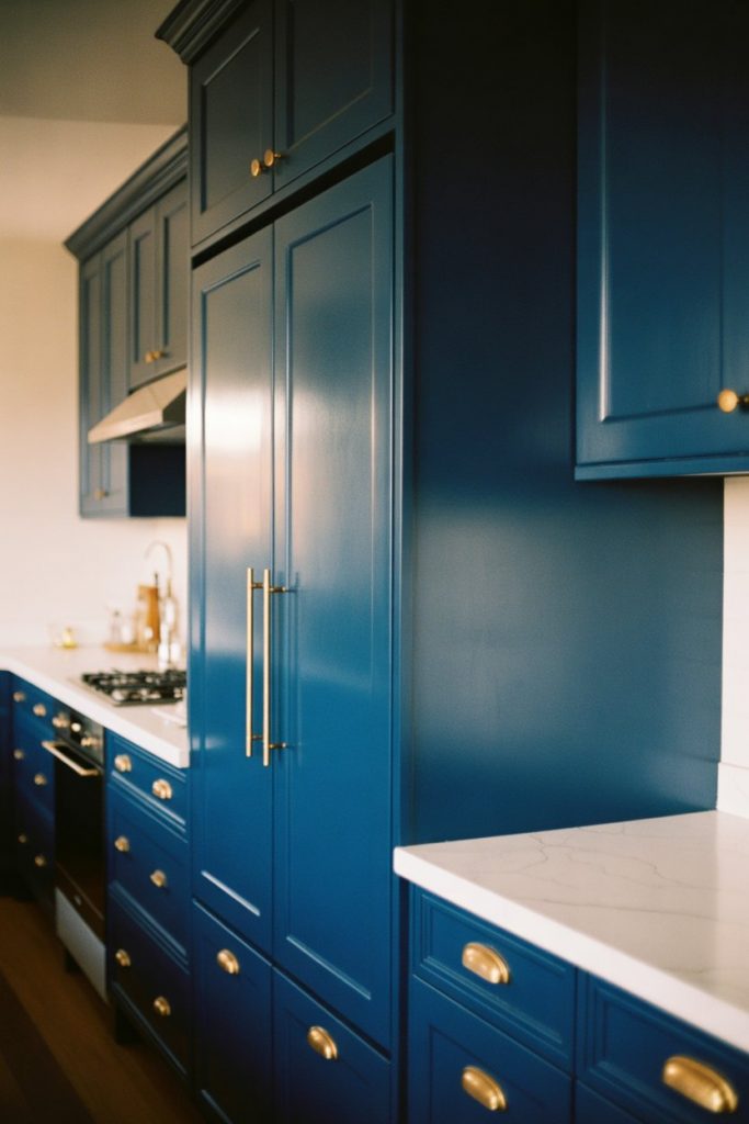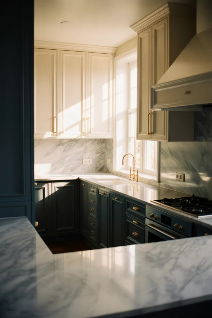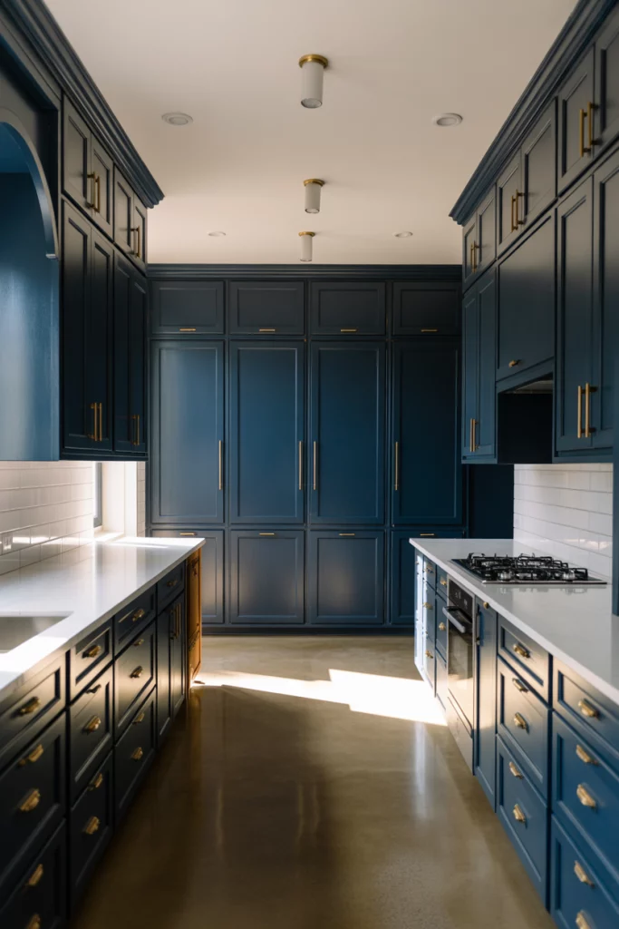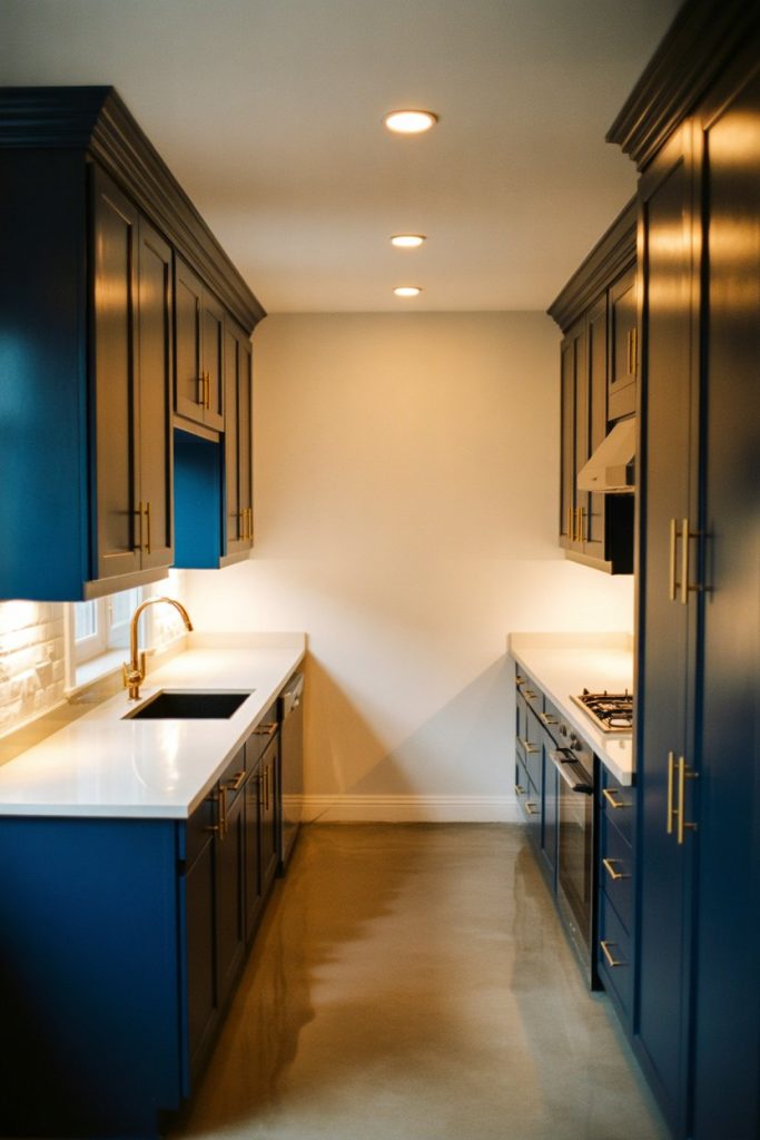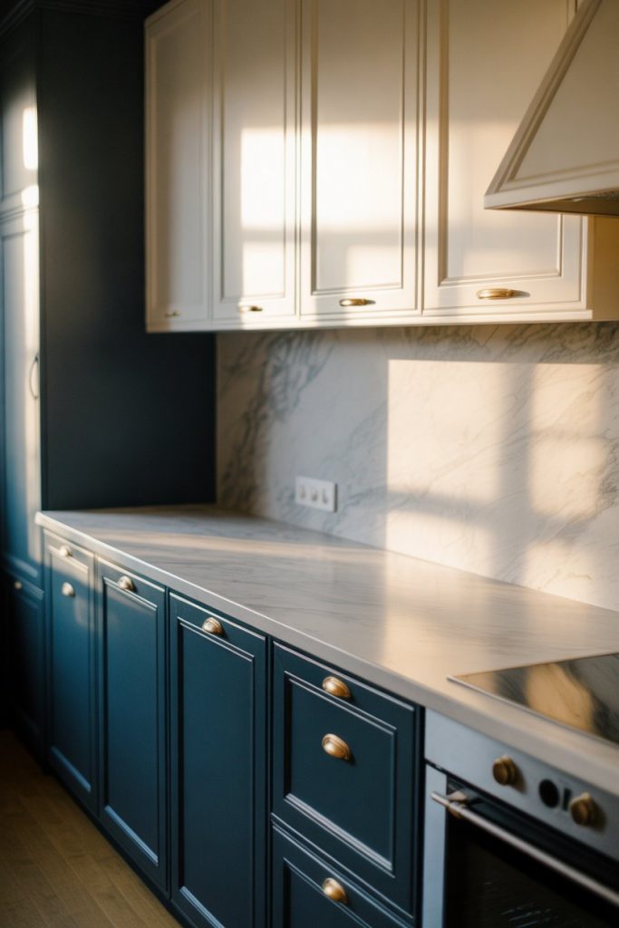 Two-toning a galley by using dark lower cabinets and white or light uppers creates visual interest without closing in the space. Navy, charcoal, or forest green on the bottom anchors the design, while lighter tones above keep the room feeling open. This layout trick is especially effective in narrow galleys where you want depth without darkness. Add brass or matte black hardware to tie the two tones together.