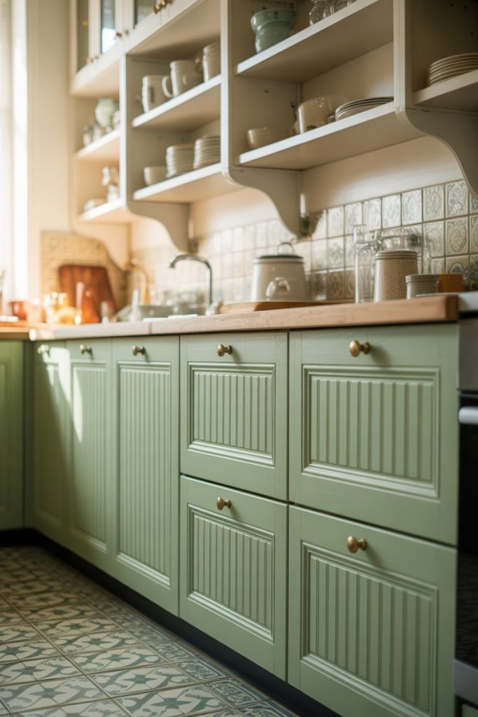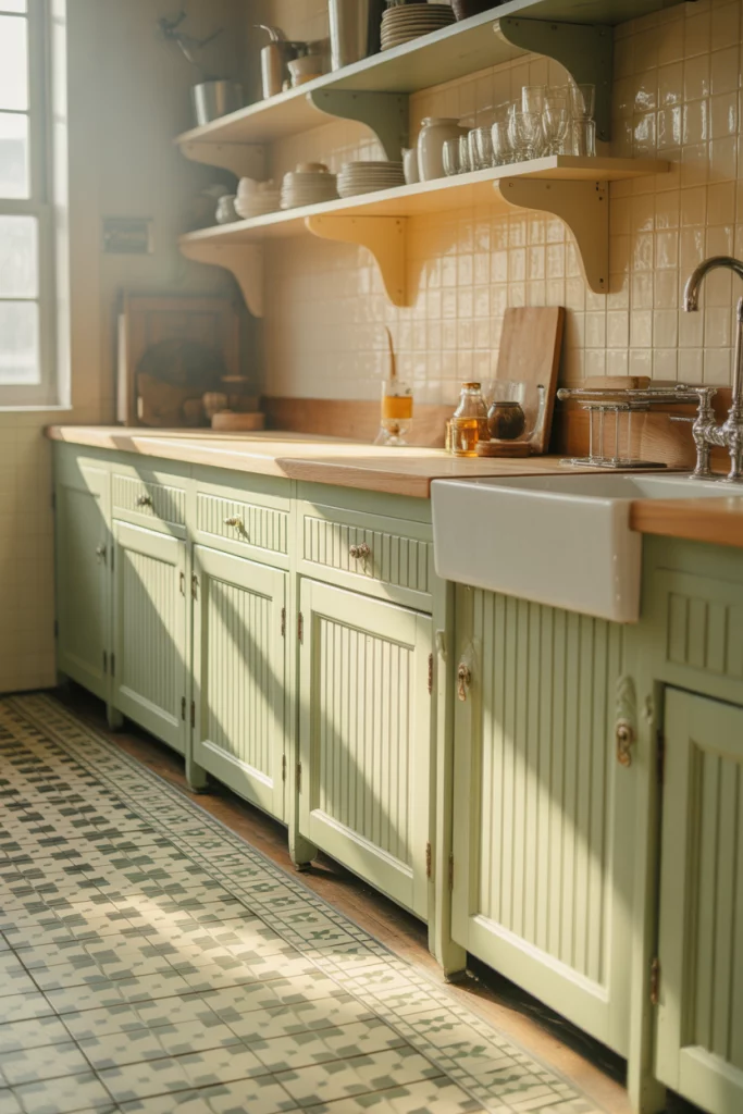 A cottage galley embraces soft colors, vintage details, and charming textures. Beadboard paneling on the lower cabinets, open shelves with scalloped edges, and pastel hues like mint green or powder blue create a welcoming, nostalgic vibe. This design works beautifully in coastal or rural homes where the goal is comfort over sleekness. Add vintage-inspired hardware and a patterned floor tile to complete the look.