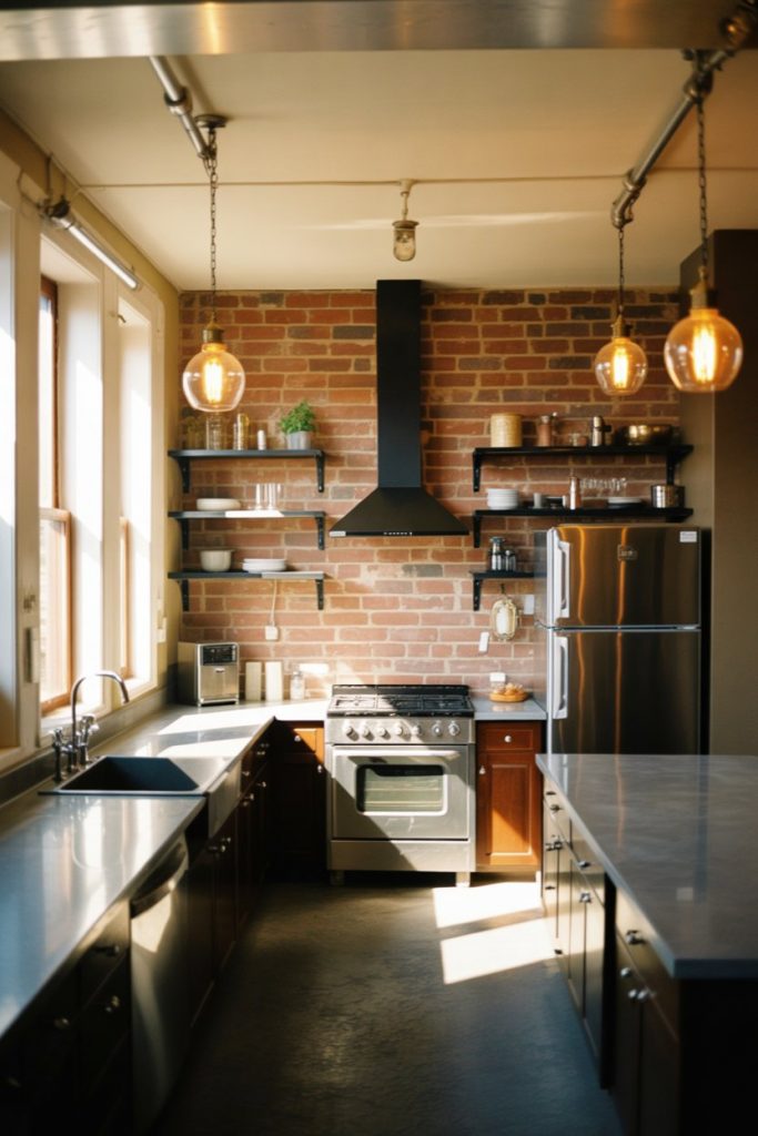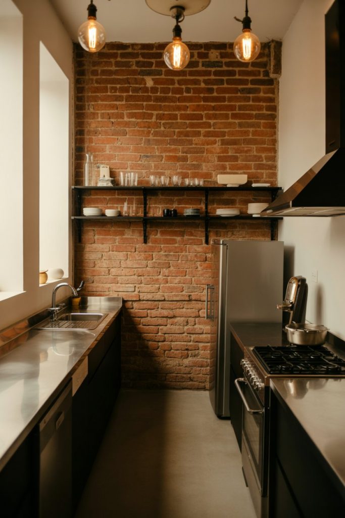 An industrial galley mixes raw materials like exposed brick, metal shelving, and concrete counters with modern appliances. This design is ideal for loft conversions or urban apartments where you want to preserve architectural character while adding function. Use Edison-bulb pendants for lighting, open metal shelves for storage, and stainless steel accents to reinforce the aesthetic. The narrow footprint actually enhances the industrial vibe, making the space feel more intentional and curated.
