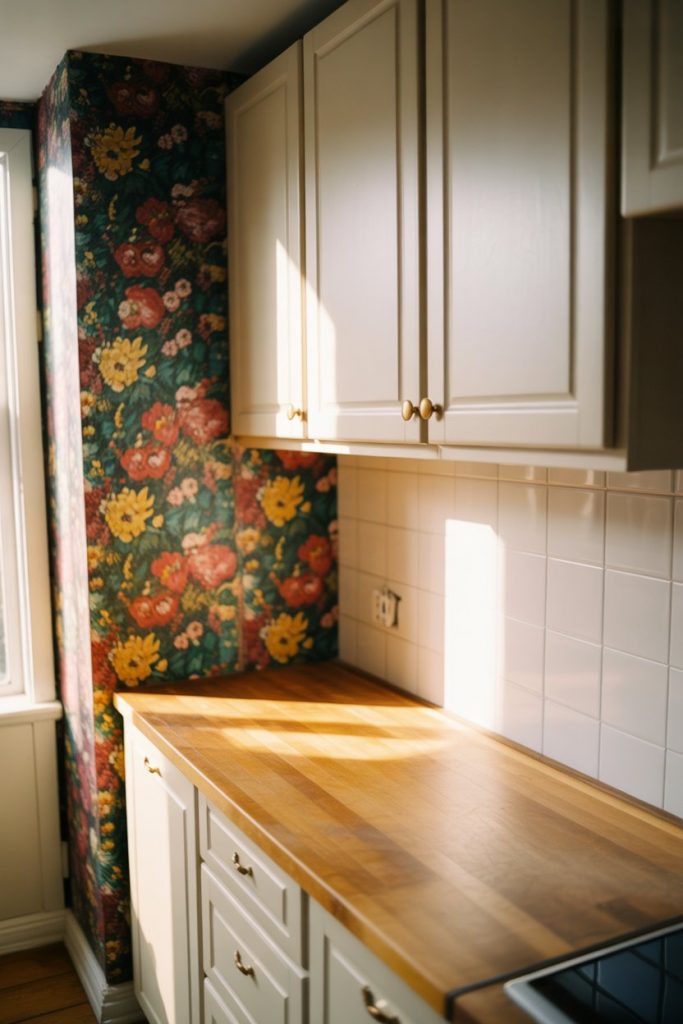 Don’t shy away from pattern in a narrow galley—bold wallpaper can actually make the space feel more intentional and designed. Choose a large-scale print or geometric pattern for one wall, keeping the rest of the design simple with white or neutral cabinets. The wallpaper draws the eye and adds personality without the commitment of paint. This is a low-cost remodel idea that delivers maximum impact, especially in rentals where you can use peel-and-stick options.