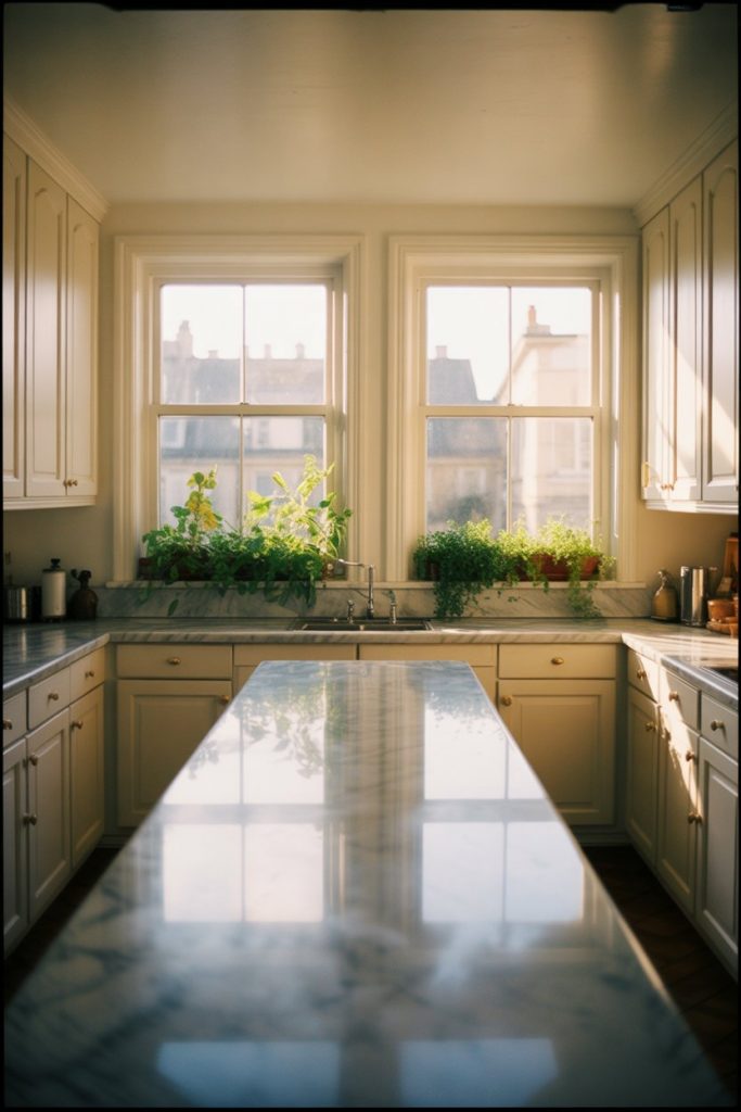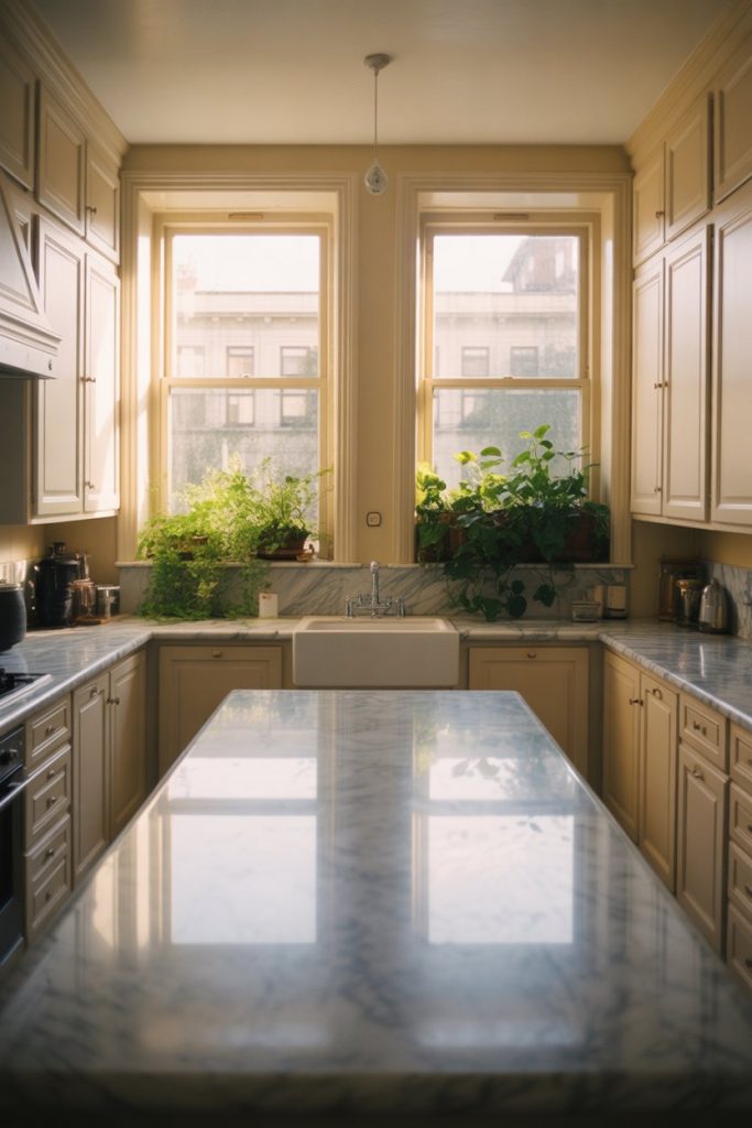 This setup works best in suburban or rural areas where you have control over exterior landscaping. Planting greenery outside the windows—boxwoods, ferns, or flowering shrubs—creates a living backdrop that changes with the seasons, making the kitchen feel connected to the outdoors.