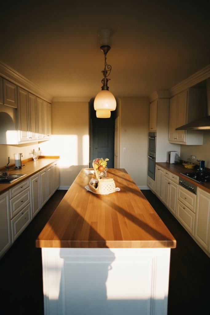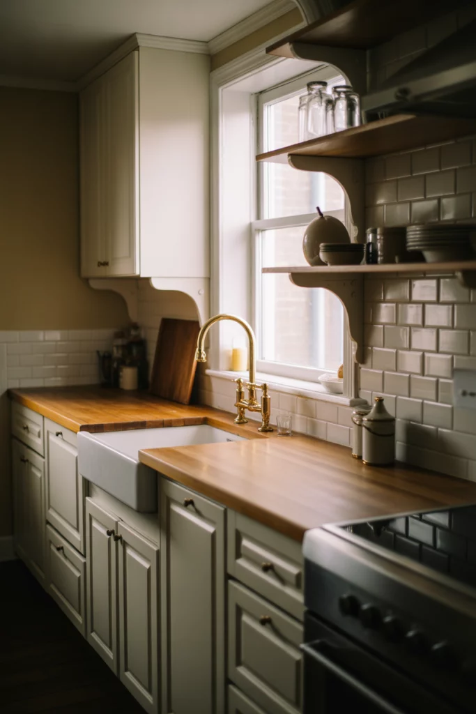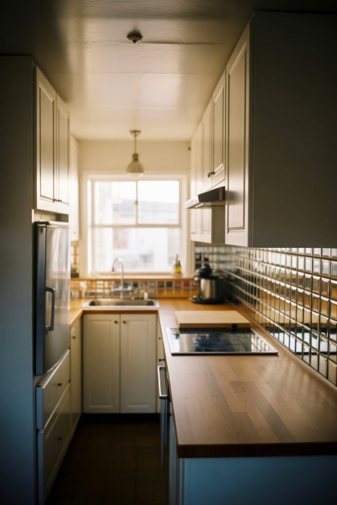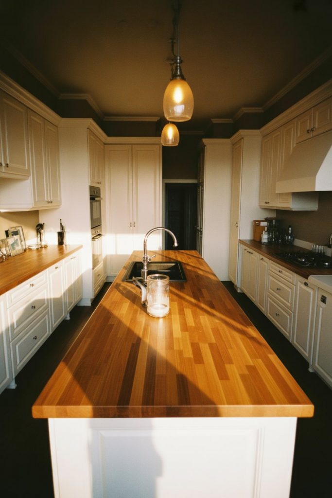 Butcher block counters bring warmth and texture to a galley without overwhelming the space. The natural wood grain pairs beautifully with white or painted cabinets, and the surface is both practical and forgiving. This is a design choice that appeals to home cooks who want a work surface that can handle heavy use. Butcher block is also more affordable than stone, making it a smart pick for budget-conscious remodel ideas.