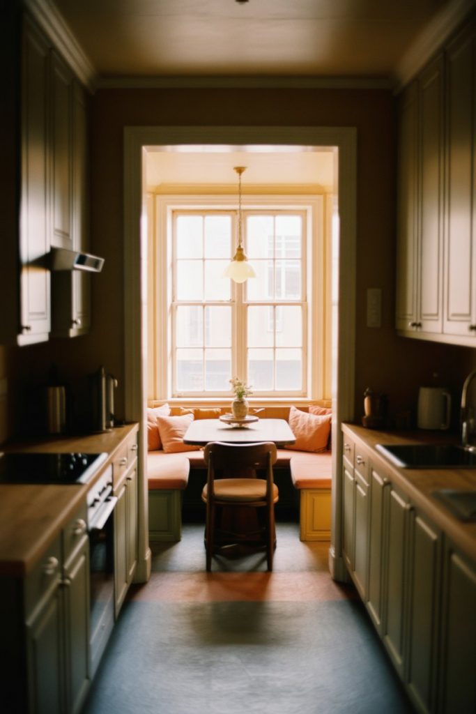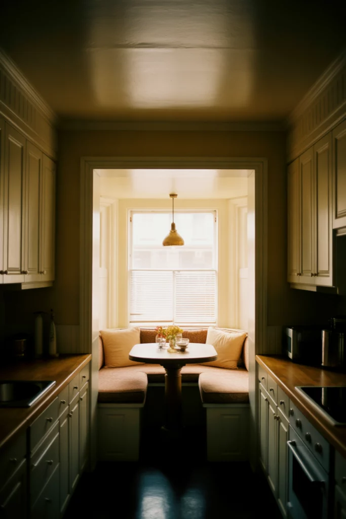 Adding a breakfast nook at the end of a galley transforms it from a pass-through into a destination. A built-in banquette with storage underneath, a small table, and a pendant light create a cozy dining spot without requiring a separate room. This layout floor plan works especially well in homes where the galley opens onto a bay window or bump-out, giving you natural light and a view. It’s a remodel idea that adds both function and charm.