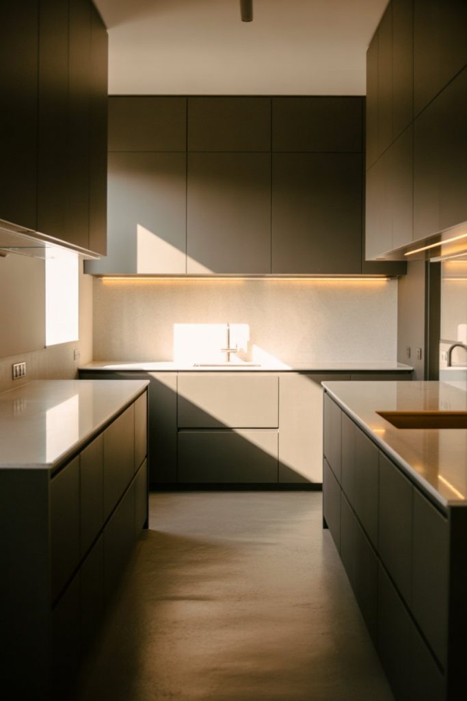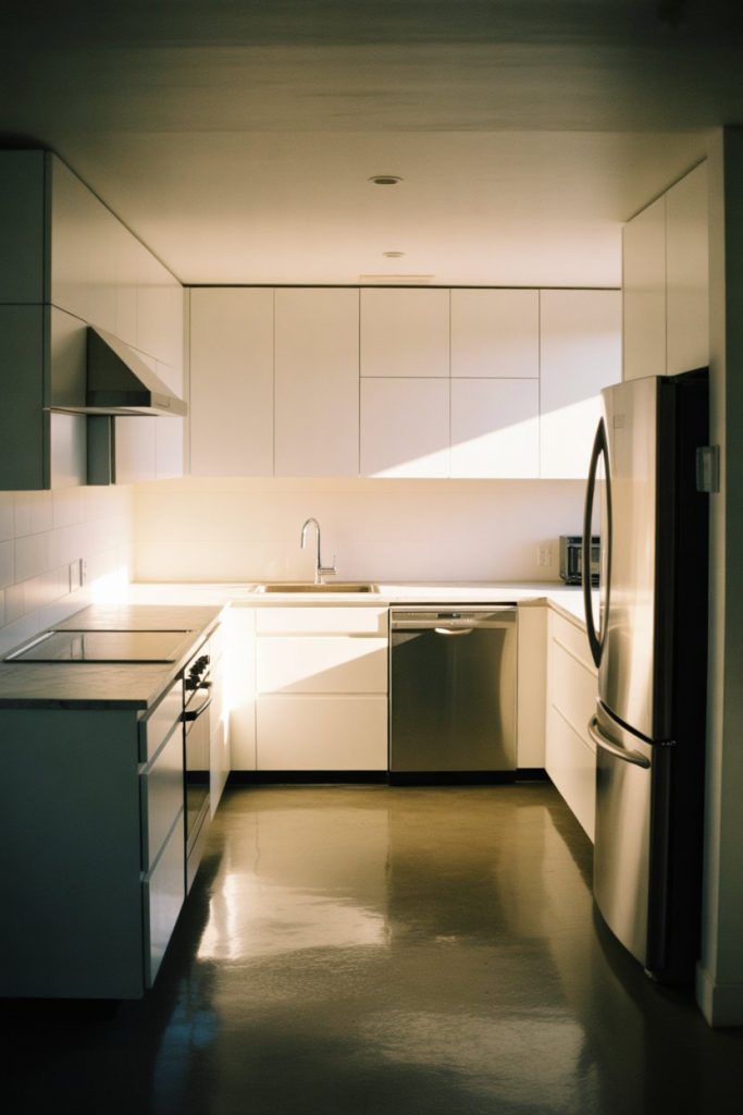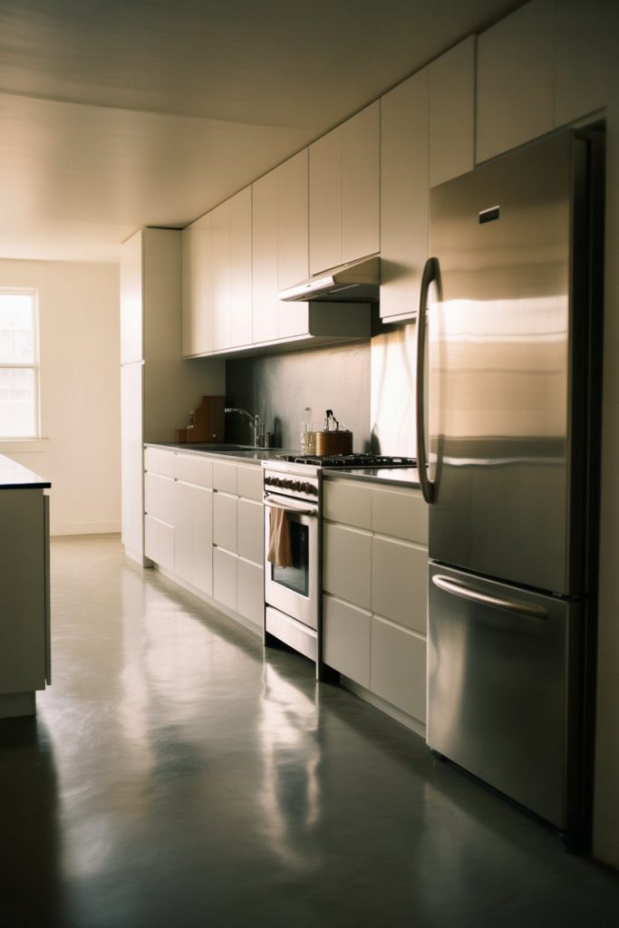 Polished or stained concrete floors are a durable, modern choice for a galley, especially in homes with radiant heating or where you want an industrial edge. The seamless surface makes the room feel longer and less interrupted, and concrete is incredibly low-maintenance—just sweep and mop. Pair it with minimalist cabinets and simple hardware to let the floor be a quiet anchor. This design is popular in new builds and loft conversions across the West Coast.
