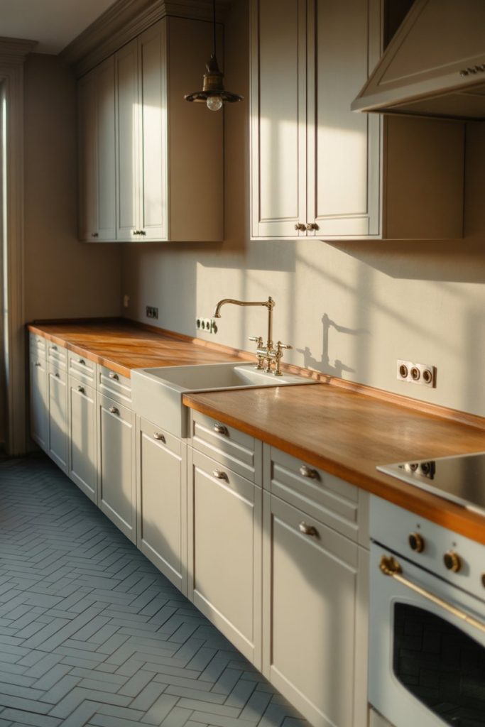 A herringbone tile floor draws the eye lengthwise, making a long galley feel even more gracious. The diagonal pattern adds movement and visual interest without overwhelming the space. Choose classic black-and-white, soft gray, or warm terracotta depending on your overall design direction. This flooring choice pairs well with both modern and traditional cabinetry, making it a versatile remodel pick.