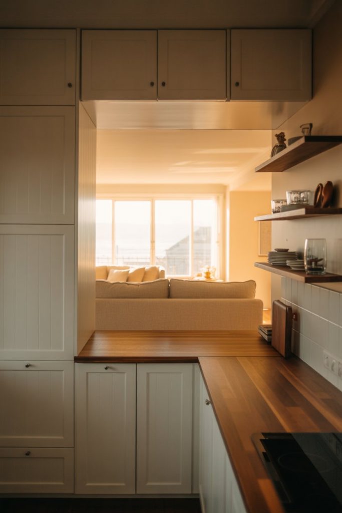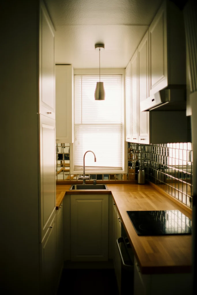 In a tiny galley, every trick matters. A mirrored backsplash reflects light and visually doubles the space, making even the narrowest kitchen feel less claustrophobic. This design choice works best in rentals or condos where you can’t change the footprint but want to maximize the illusion of openness. Pair it with under-cabinet lighting to amplify the effect, and keep countertops as clear as possible to maintain the sense of breathing room.
