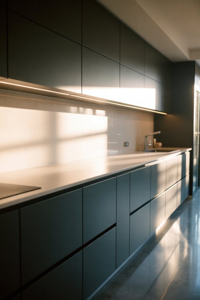 Flat-front slab cabinets define the modern galley, offering a sleek, handleless look that emphasizes clean lines. This minimalist design works beautifully in narrow spaces because it reduces visual noise. Choose matte finishes in charcoal, navy, or forest green to add depth without clutter. Pair with integrated appliances and a simple stone or quartz counter to let the architecture speak for itself.