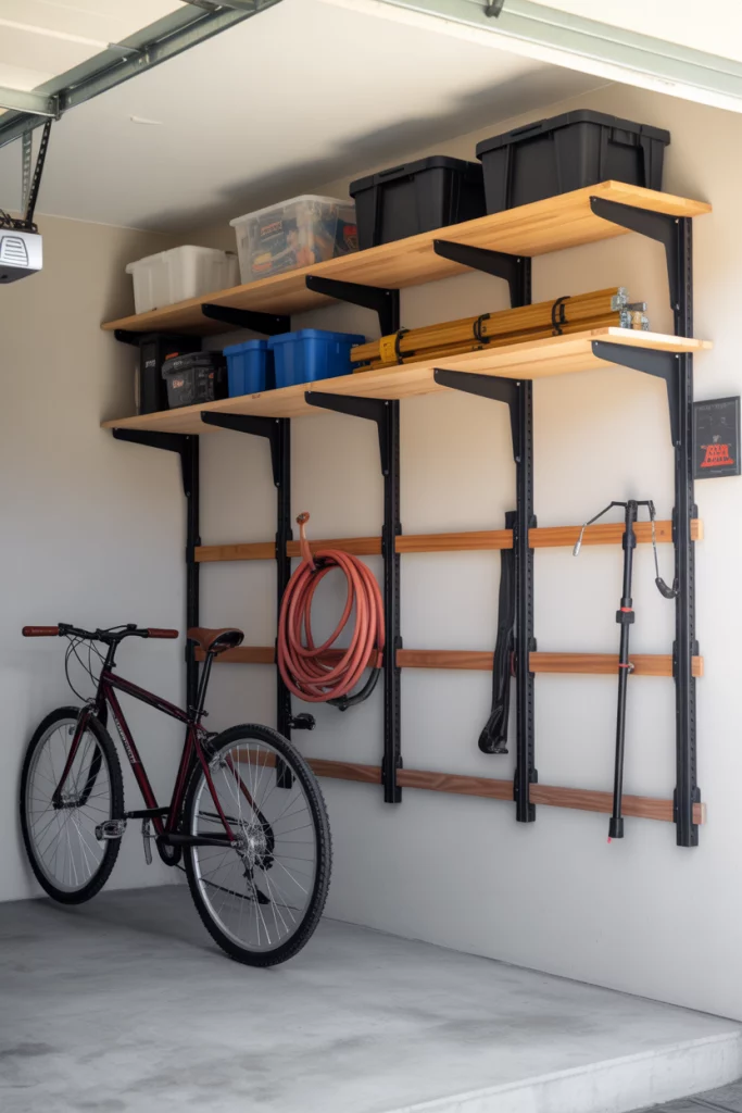 For garages where every inch counts, foldable wall racks provide flexible storage without clutter. Ideal for a 1 car or small space garage, these easy diy racks can hold ladders, hoses, or even bikes. They’re cheap, quick to install, and blend perfectly with modern minimalist styles while keeping tools workshop items off the floor.