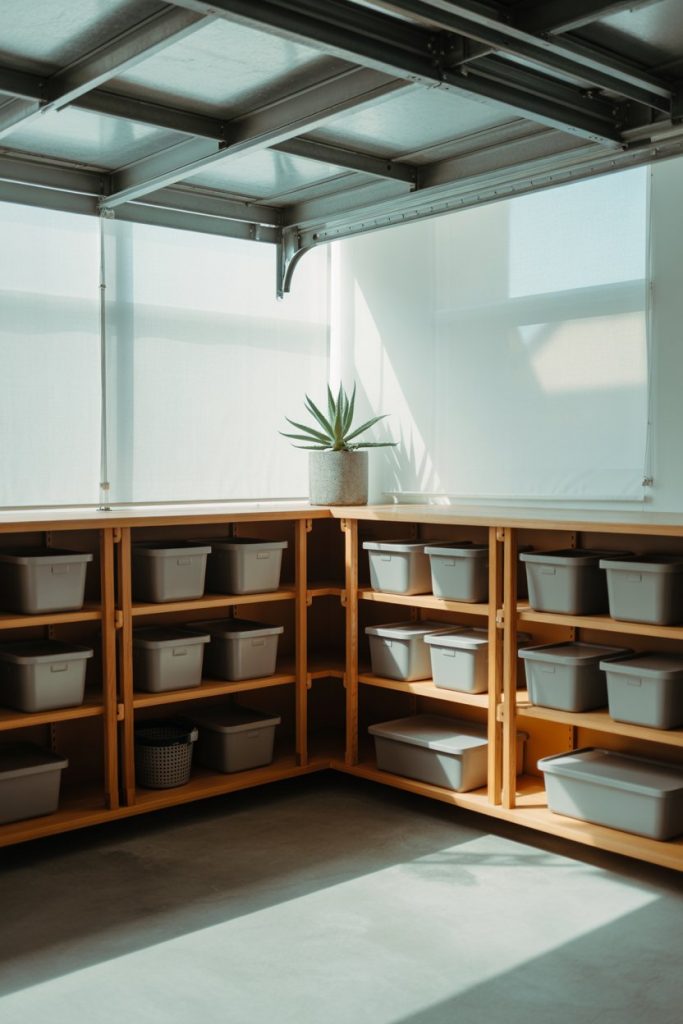 Transparent bins let you see exactly what’s inside—no more digging through storage boxes. Use them for bikes gear, shoes, and tools workshop accessories. Label each bin for clarity. This cheap, affordable, and easy diy method adds visual order while keeping your modern garage sleek and efficient.