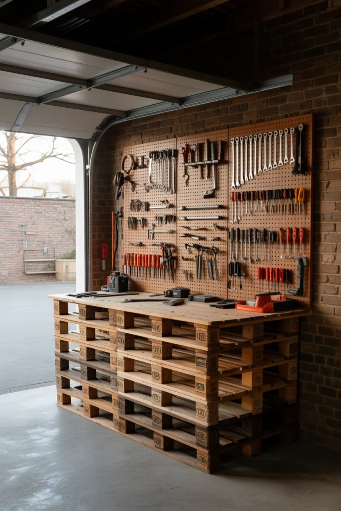 Reclaimed pallets can become a sturdy workshop bench that costs next to nothing. This easy diy project is cheap, eco-friendly, and provides plenty of surface area for tools and projects. Pair it with pegboards or storage shelves above for an organized and modern look that fits any budget.