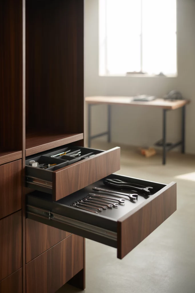 Maximize under-cabinet space with slide-out drawers. These shallow compartments are perfect for tools, extension cords, or car maintenance supplies. An easy diy upgrade that gives your workshop a professional mechanic feel, it’s a modern, space-saving solution for both 2 car and 3 car garages.