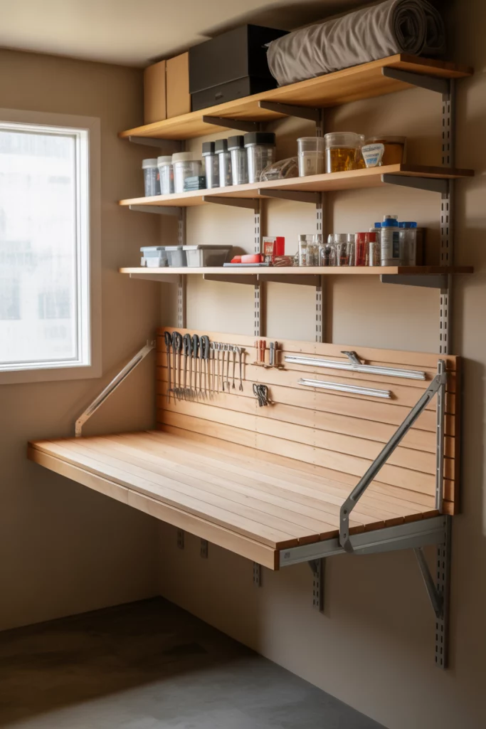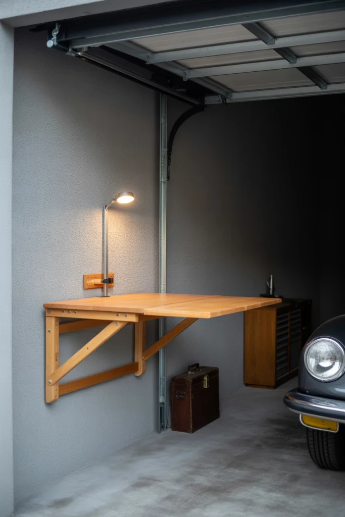 A foldable table that tucks into the wall doubles as a workshop and a car bay. Use hinges and locks to create an easy diy, cheap, and efficient surface. Perfect for small space garages or 1 car layouts, it gives you instant work area without permanent clutter—ideal for anyone working on a budget.