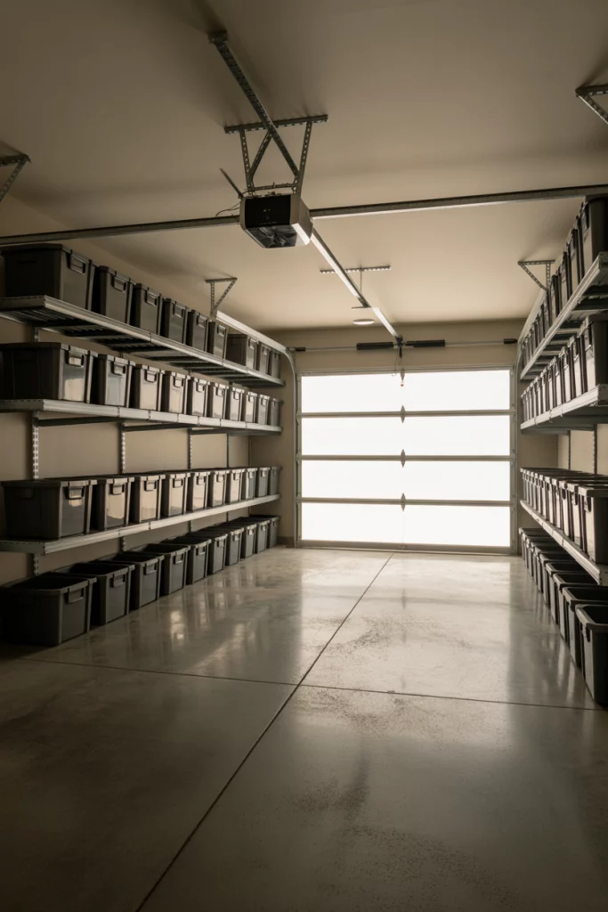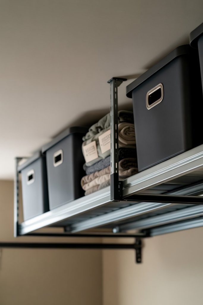 Install metal rails on the ceiling to hold sliding plastic bins. This storage trick is great for holiday décor, camping gear, or rarely used tools. It’s a cheap and modern concept that fits perfectly in 3 car tandem or 2 car garages. Even better—it keeps dust away while leaving your floors clear for a mechanic workspace.