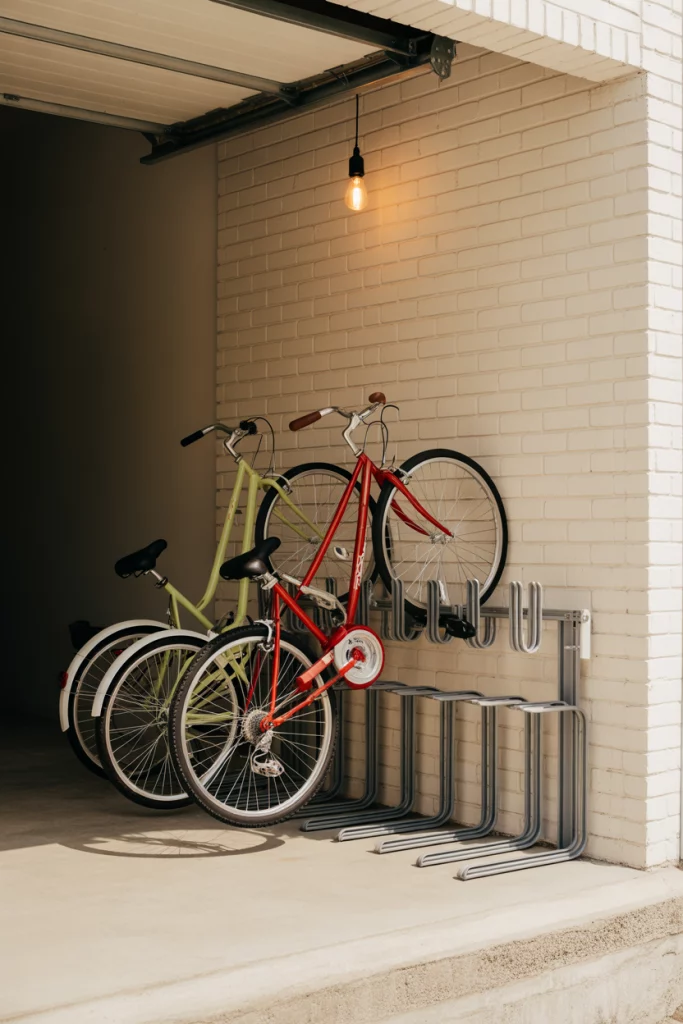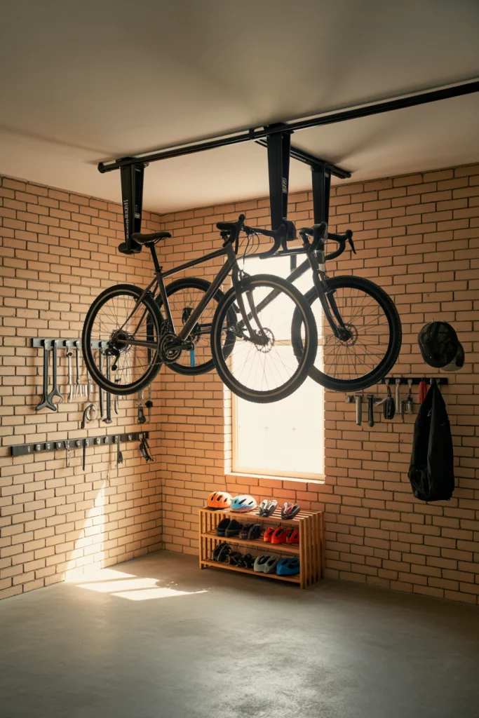Tired of tripping over bikes? Install wall-mounted hooks or ceiling hoists to lift them off the floor. This cheap and easy method adds valuable storage in any small space. Pair it with a lower shoe rack or shelf for helmets and gloves to create a compact, modern bike station in your workshop.