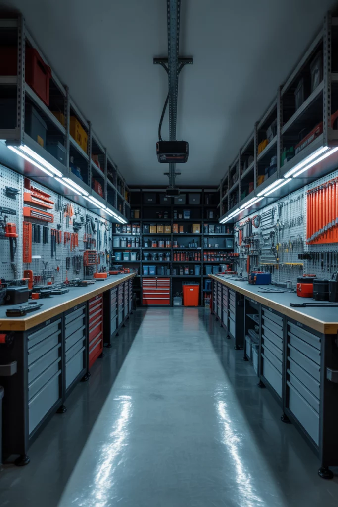 Good lighting turns your workshop from cluttered to professional. Add bright LED strips above storage shelves, benches, and tools workshop areas. It’s an easy diy, affordable update that makes your modern garage both safer and more inviting—especially for mechanic or crafting projects.