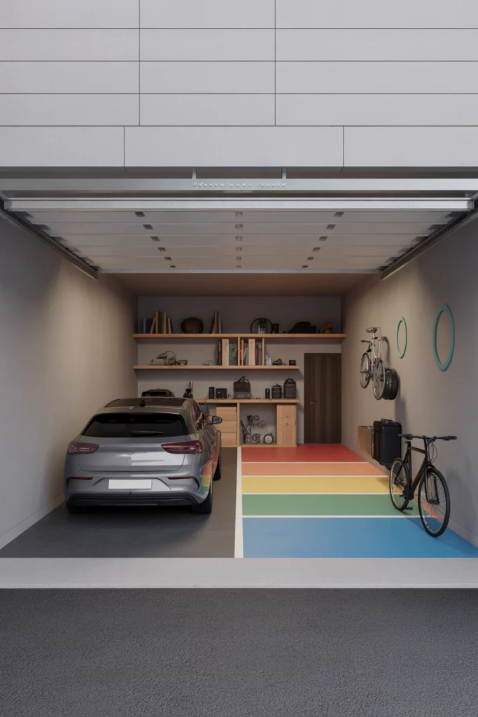 Paint your garage floor in colorful zones to define areas—car parking, tools, bikes, and gear storage. This simple diy trick gives your space a modern and stylish edge while improving organization. It’s cheap, creative, and helps every household member know where things belong, even in a 3 car garage.
